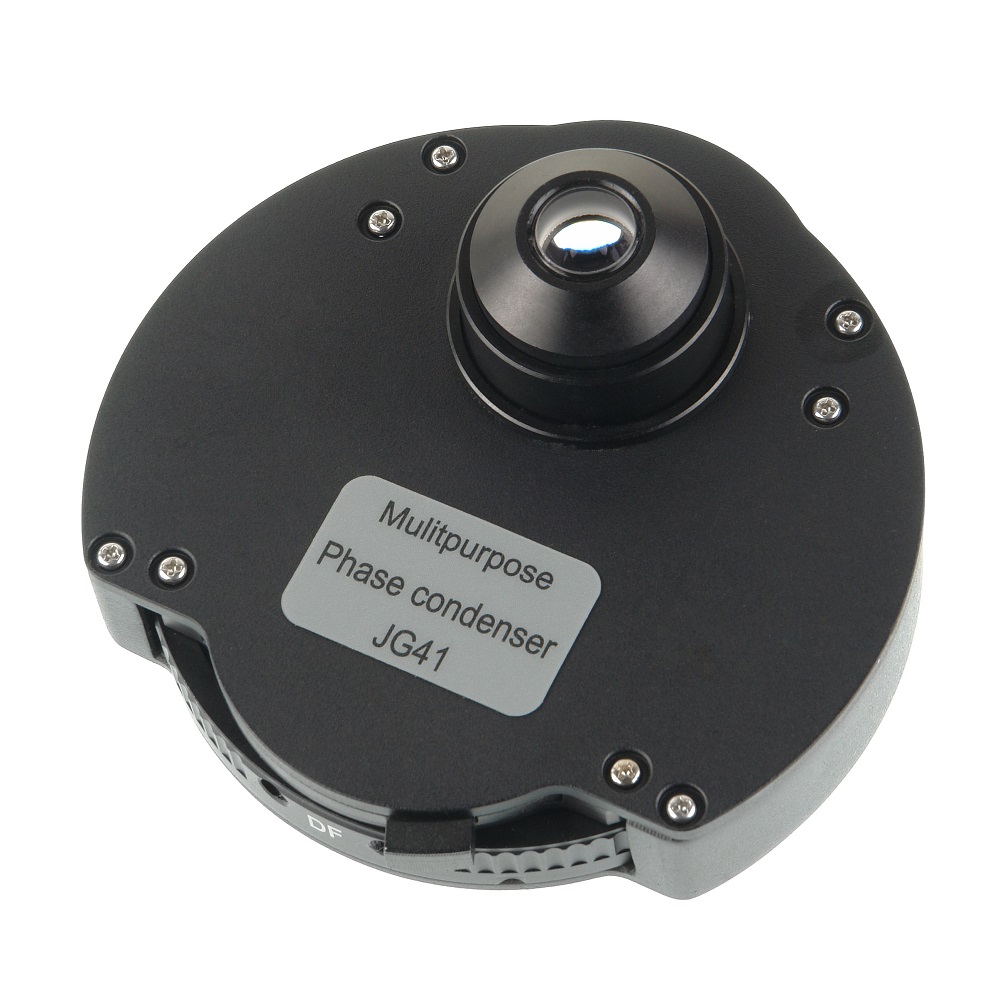 Фазовый конденсор вставляется в кольцо кронштейна конденсора микроскопа вместо обычного светлопольного конденсора и зажимается винтом обычным способом.