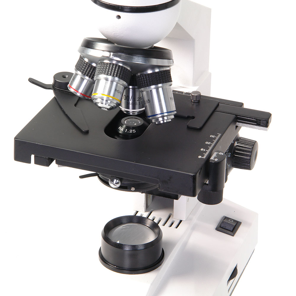Информативность и комфорт при исследованиях обеспечивается высоким качеством объективов. Все объективы парфокальны, поэтому при смене увеличений объект исследования не теряется. Объективы микроскопа установлены на револьверном устройстве, рассчитанном на 4 объектива, что позволяет наблюдателю быстро переходить к исследованиям с различными увеличениями.