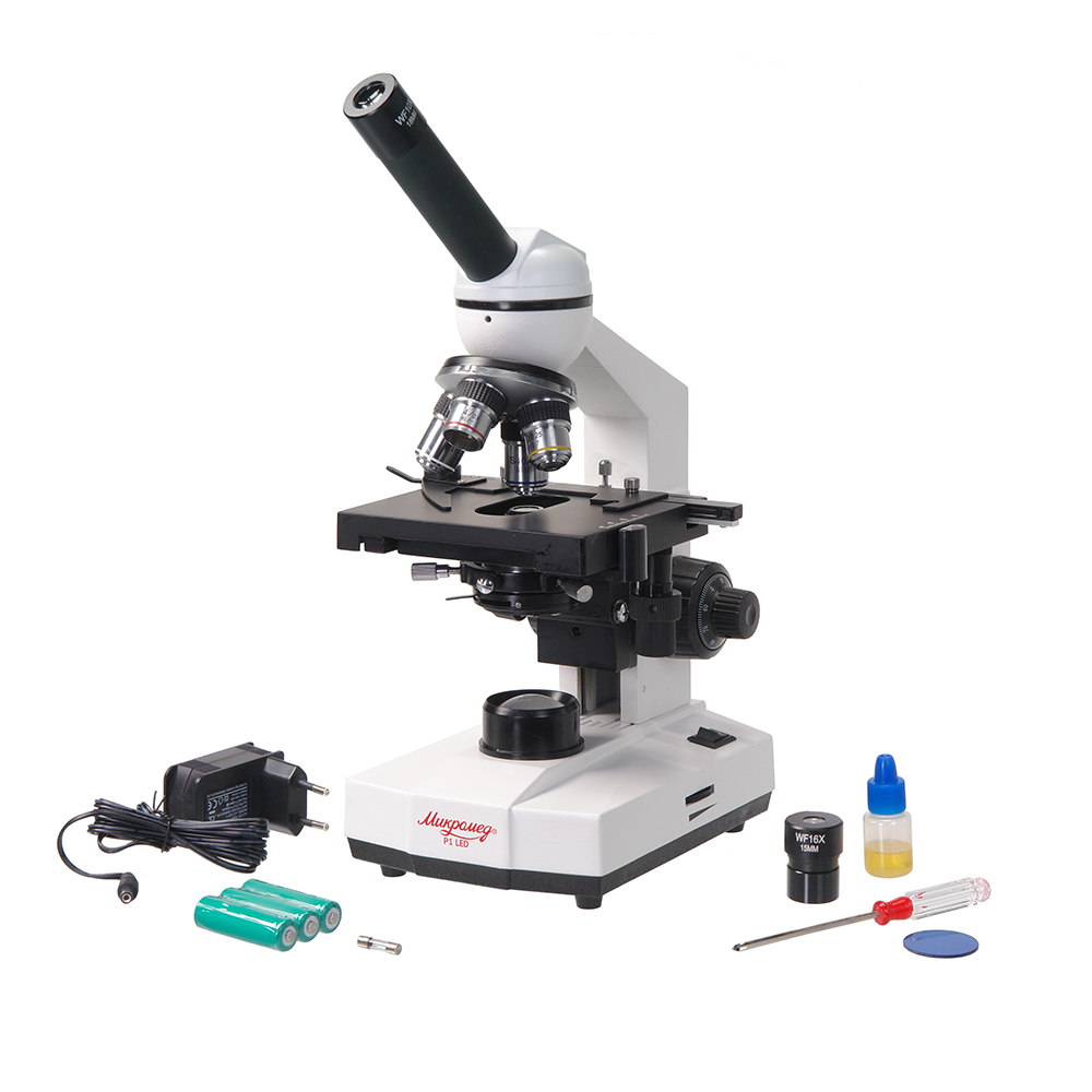 - Микроскоп Микромед Р-1 (LED) со встроенным в основание осветителем с регулировкой яркости, механизмом фокусировки и предметным столиком 100 мм х 125 мм – 1 шт.