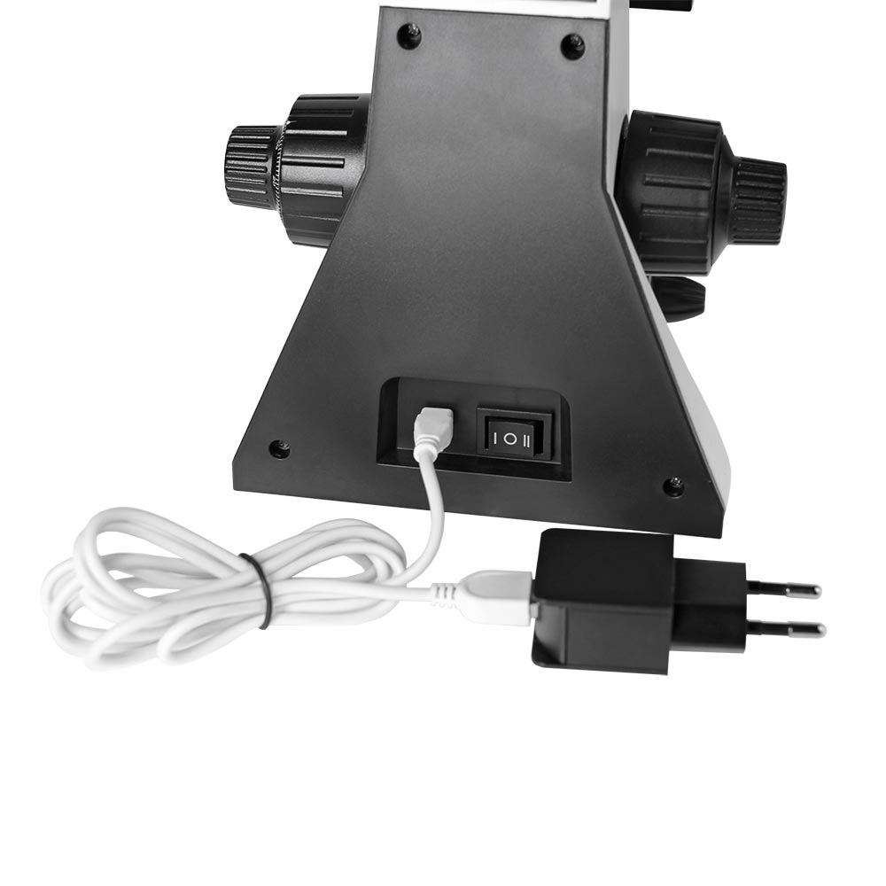 Питание осветителей производится от 3-х батареек формата АА или от сети переменного тока 220 - 240 В через входящий в комплект сетевой адаптер. Также микроскоп может получать питание от порта USB компьютера. Возможность питания микроскопа от батарей или внешних устройств позволяет пользоваться микроскопом не только в учебном классе или дома, но и в любых ситуациях, когда электросеть недоступна.