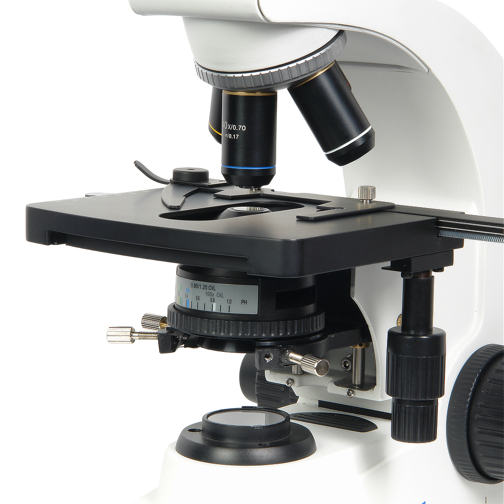 В комплекте микроскопа объективы с коррекцией на бесконечность 4x/0.13, 10x/0.30, 40x/0.70 и иммерсионный объектив 100x/1.25 oil. По дополнительному заказу может быть приобретен объектив 60х/0.80. Высокое оптическое качество объективов обеспечивает информативность и комфорт при исследованиях и отличное качество записываемых изображений. Объективы стандартизованы по DIN и имеют парфокальную высоту 45 мм.