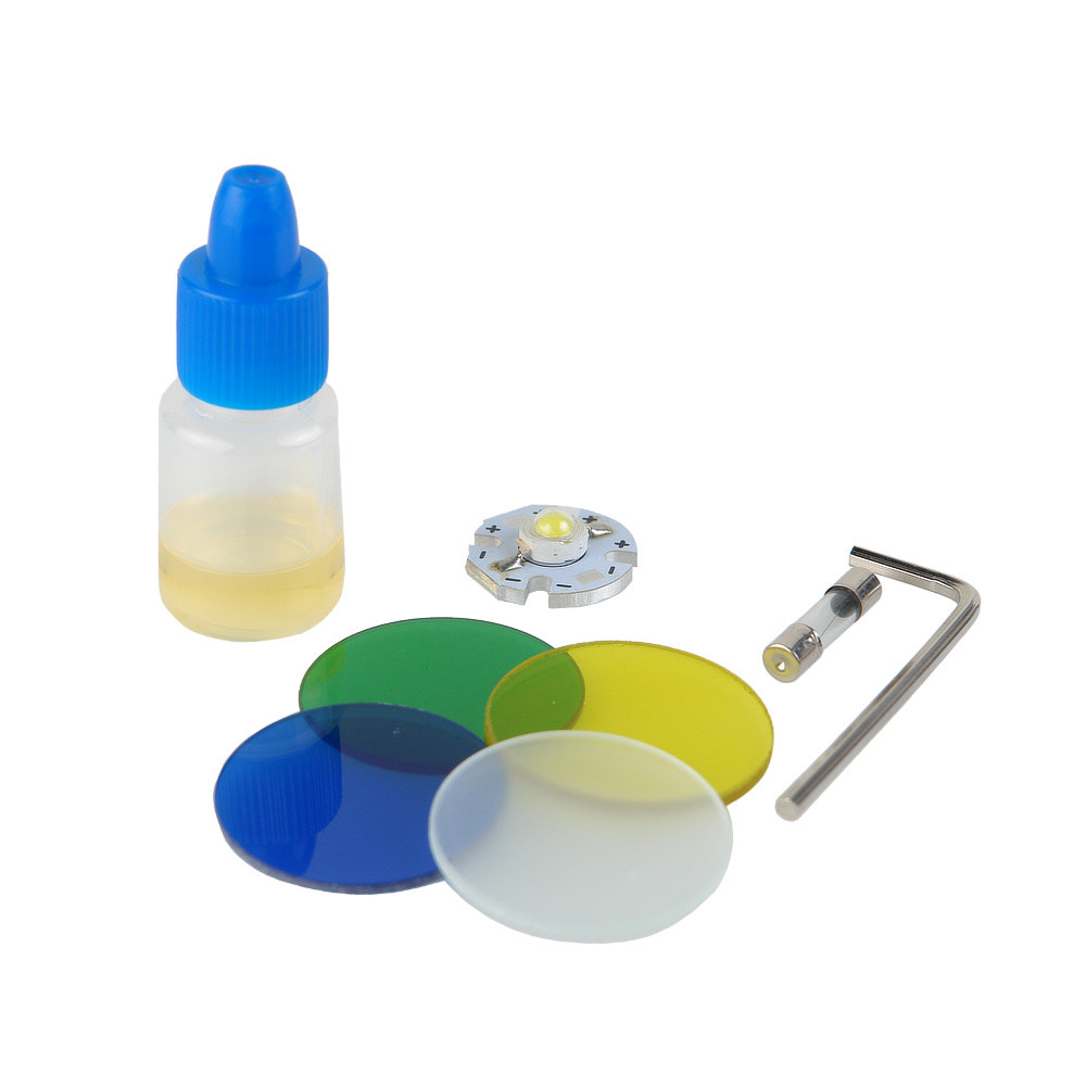 Иммперсионное масло, светодиод, предохранитель, светофильтры и шестигранный ключ.