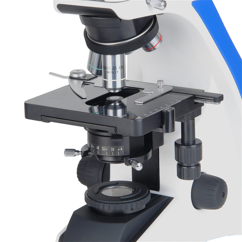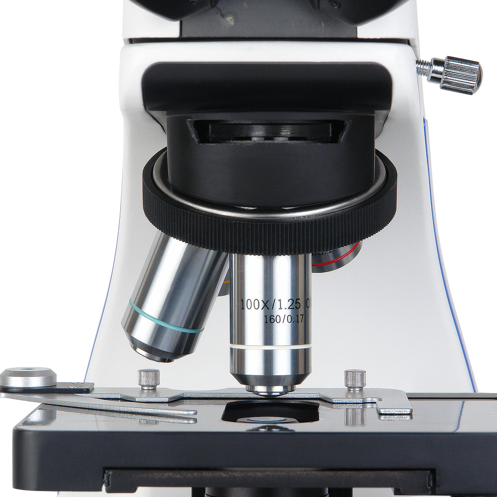 В комплекте микроскопа объективы с ахроматической коррекцией 4x/0.10, 10x/0.25, 40x/0.65 и иммерсионный объектив 100x/1.25 oil. Дополнительно микроскоп может быть укомплектован объективами 20х/0.40 и 60х/0.85. Парфокальная высота объективов 45 мм, стандарт DIN. Объективы установлены на револьверном устройстве, рассчитанном на 5 объективов.