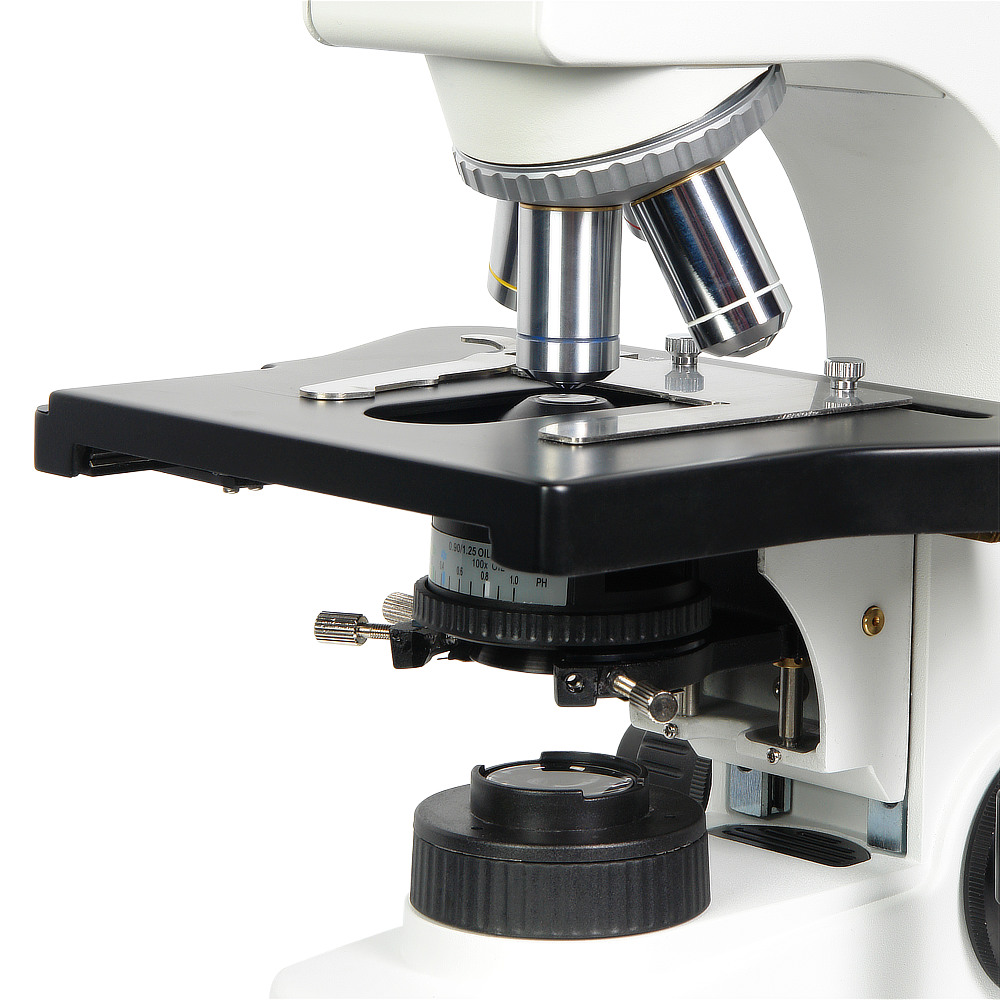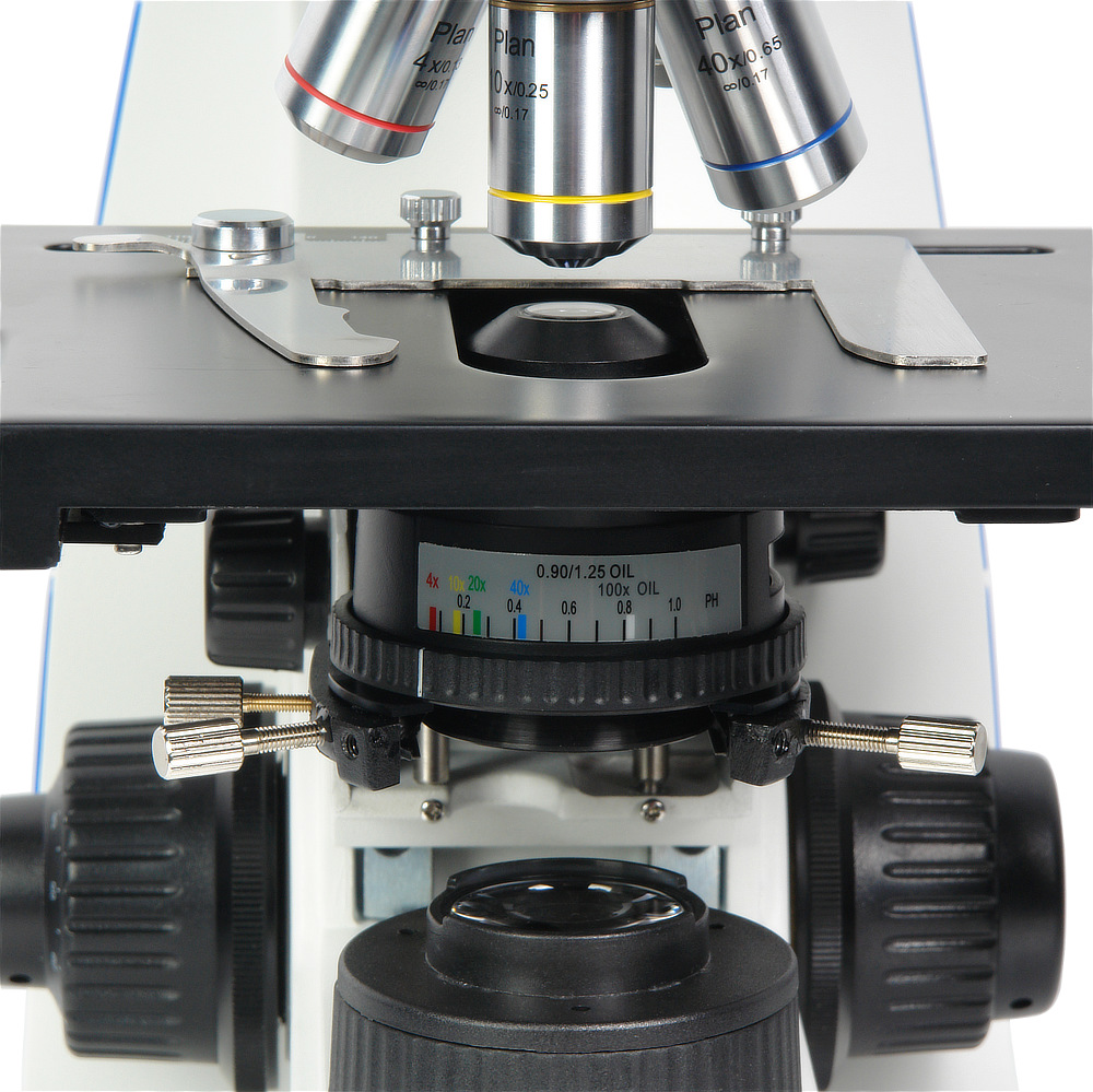 В комплекте микроскопа - объективы с планахроматической коррекцией Plan 4x/0.13, Plan 10x/0.25, Plan 40x/0.65 и Plan 100x/1.25 oil. По дополнительному заказу микроскоп может быть укомплектован объективами Plan 20х/0.45, Plan 60х/0.80, флюоритовыми объективами Plan Fluor, объективами для работы в поляризованном свете SP POL и объективами фазового контраста Plan PH. Антигрибковое покрытие оптических поверхностей объективов позволяет без ограничений использовать микроскоп в биологических лабораториях.