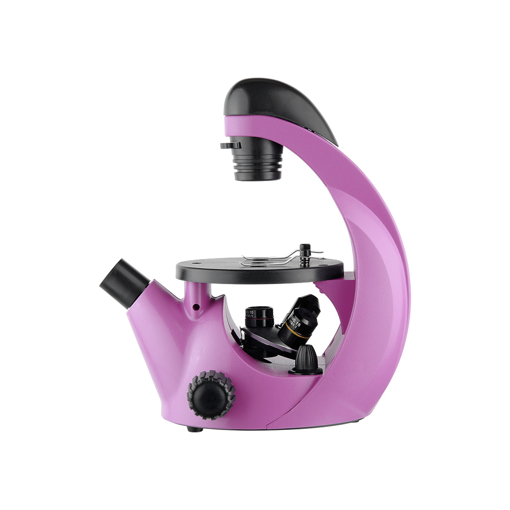 Инвертированный микроскоп для начинающих. Его объективы расположены под предметным столиком, осветитель находится сверху, а предметный столик расположен над объективом. Благодаря такому устройству с его помощью можно исследовать крупные объекты, которые нельзя разместить на столике «прямого» микроскопа.