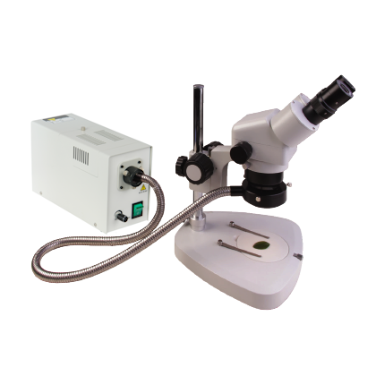 Используется с волоконными осветителями для освещения поля зрения стереомикроскопа "холодным светом" (холодным – в градусах по Цельсию; цветовая температура галогенной лампы – примерно 3000°К). Необходим для объектов исследования, которые не терпят нагрева.