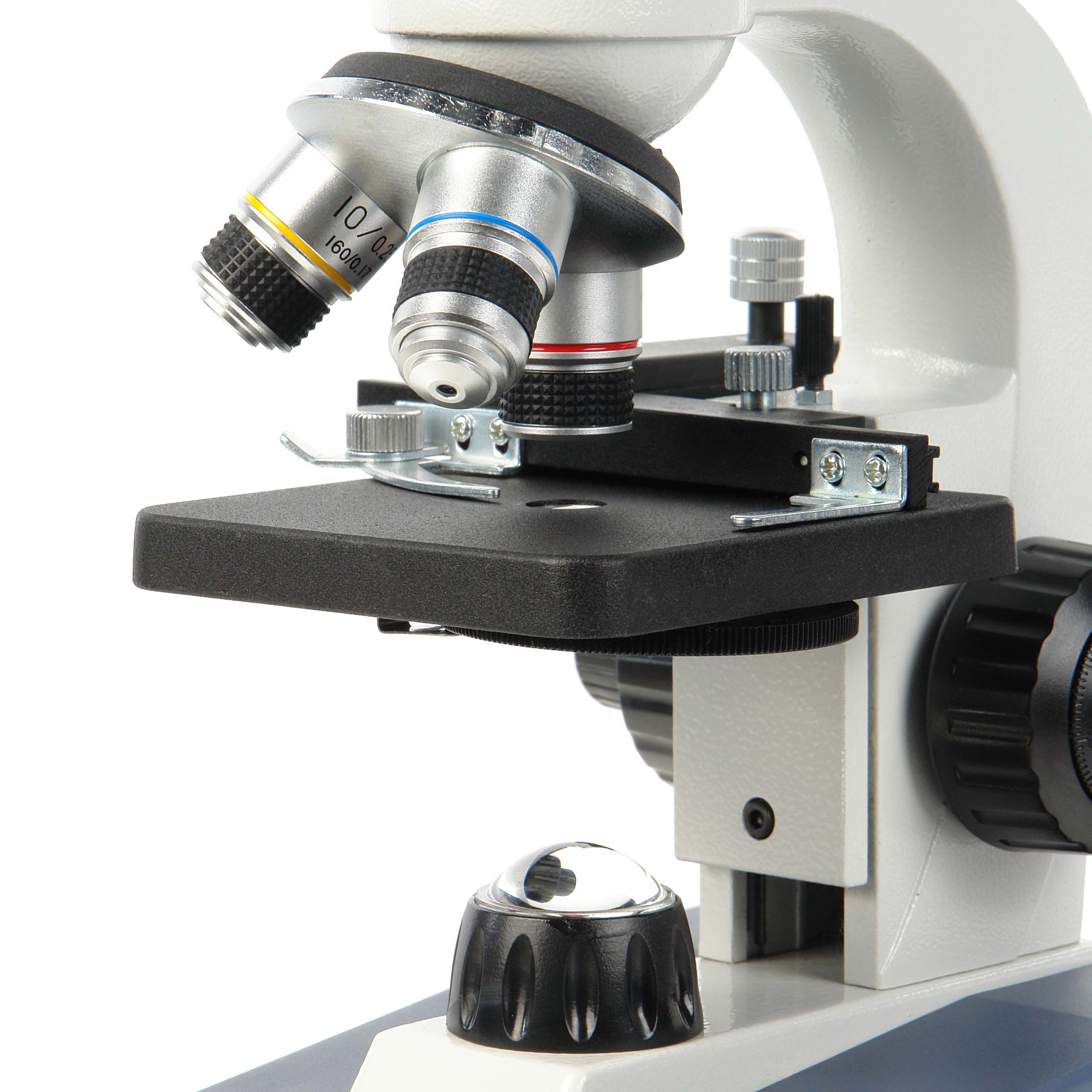 В комплекте микроскопа 3 объектива с ахроматической коррекцией 4x/0.10, 10x/0.25 и 40x/0.65 (S). Объективы рассчитаны на тубус 160 мм и покровное стекло 0.17 мм. Парфокальная высота объективов 33 мм, установочная резьба стандарта RMS.