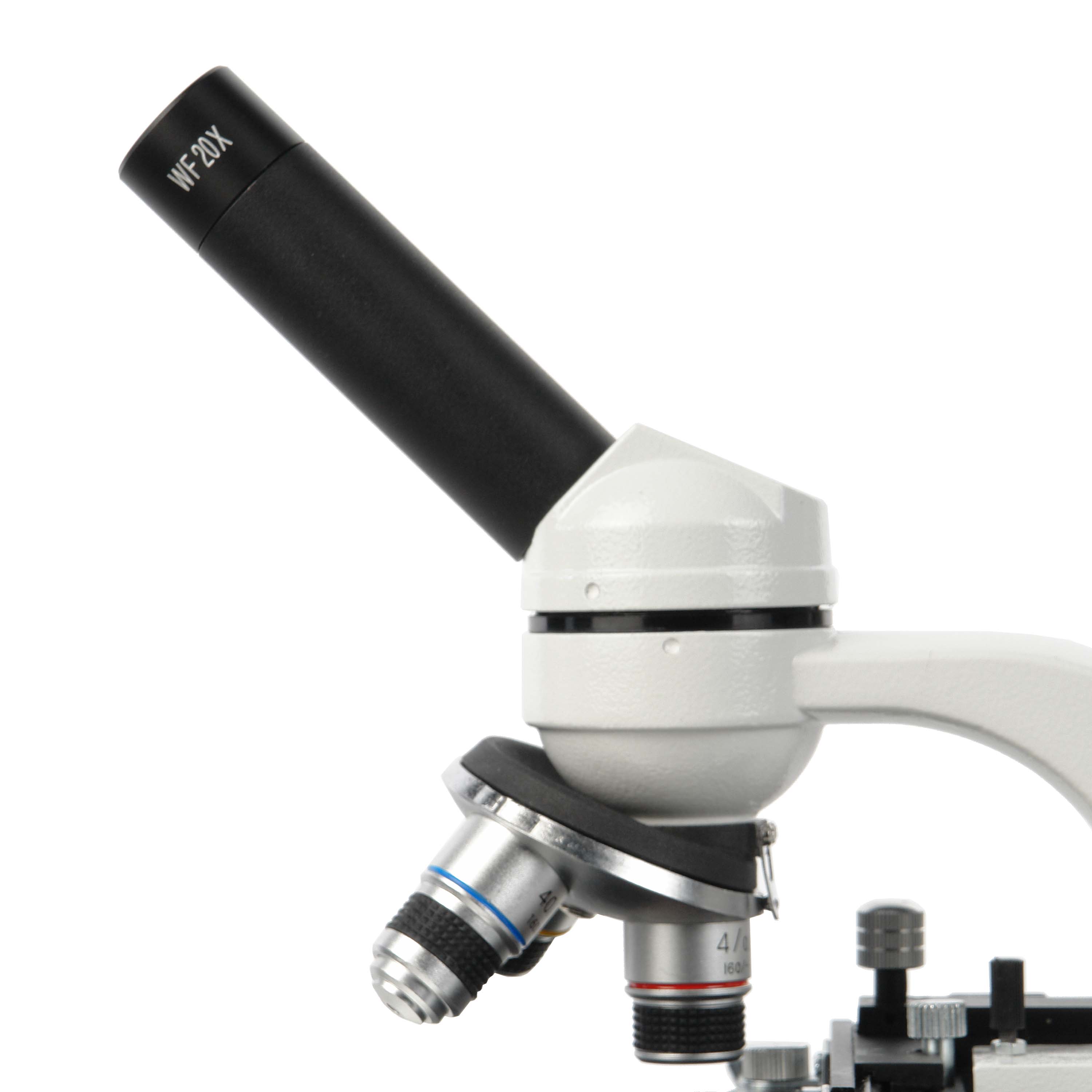 В комплект микроскопа входят окуляры широкого поля WF 10х и WF 20х, с ними общее увеличение микроскопа составляет от 40х до 800х.