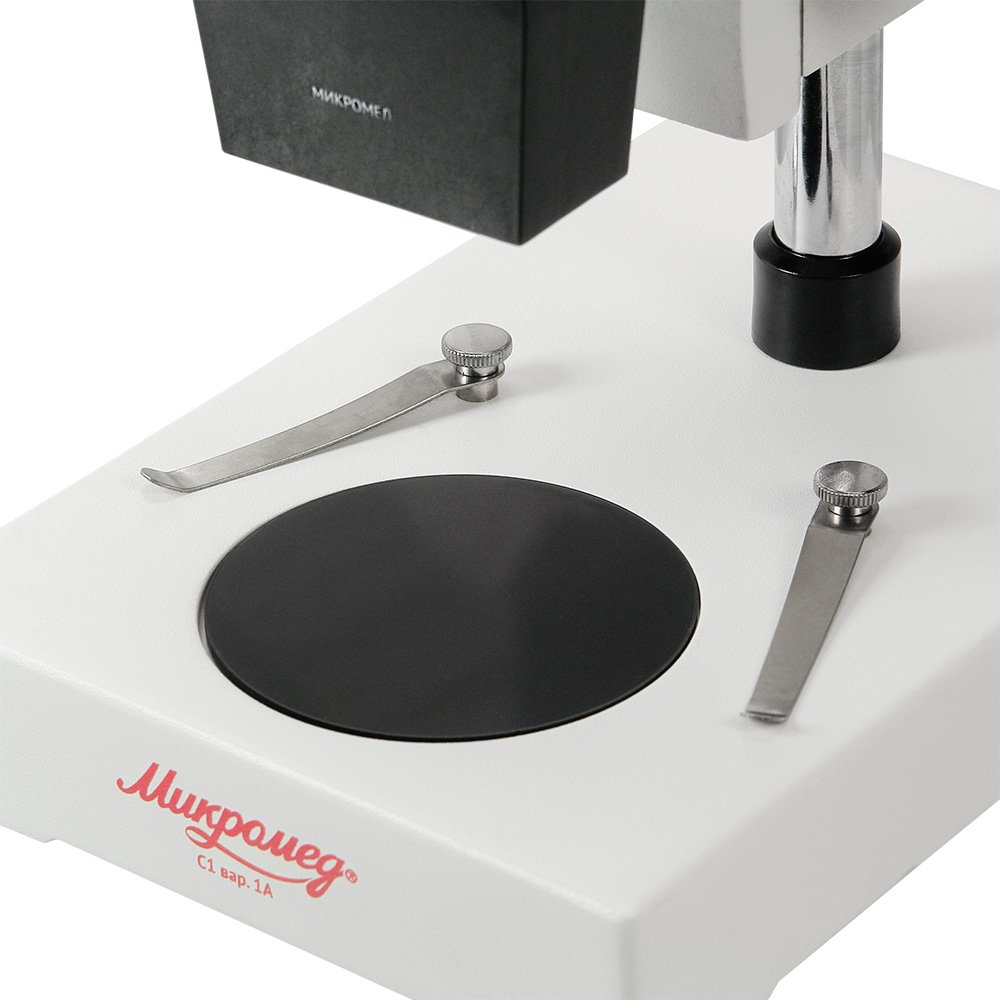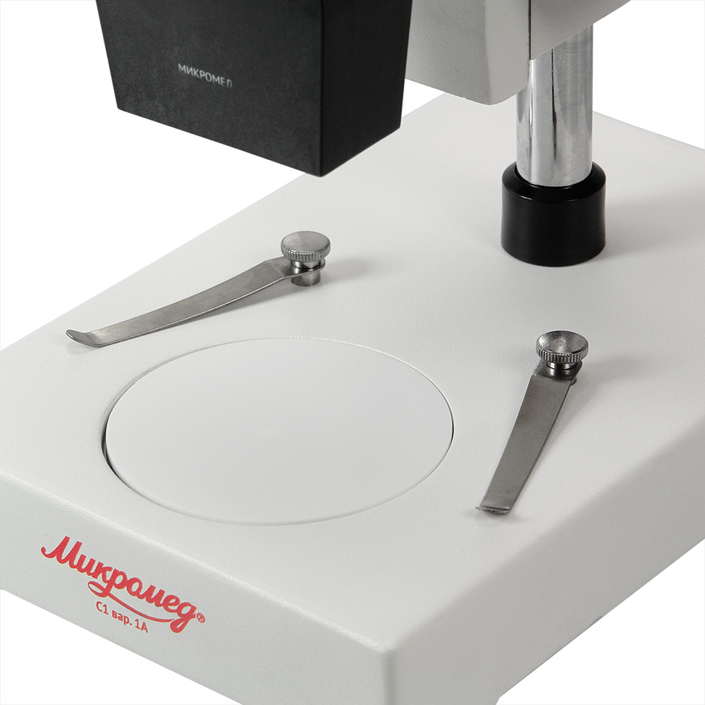 - Основание с предметной вставкой Ø60 мм с зажимами, штативной штангой и установленной оптической головкой с блоком объективов и окулярными тубусами