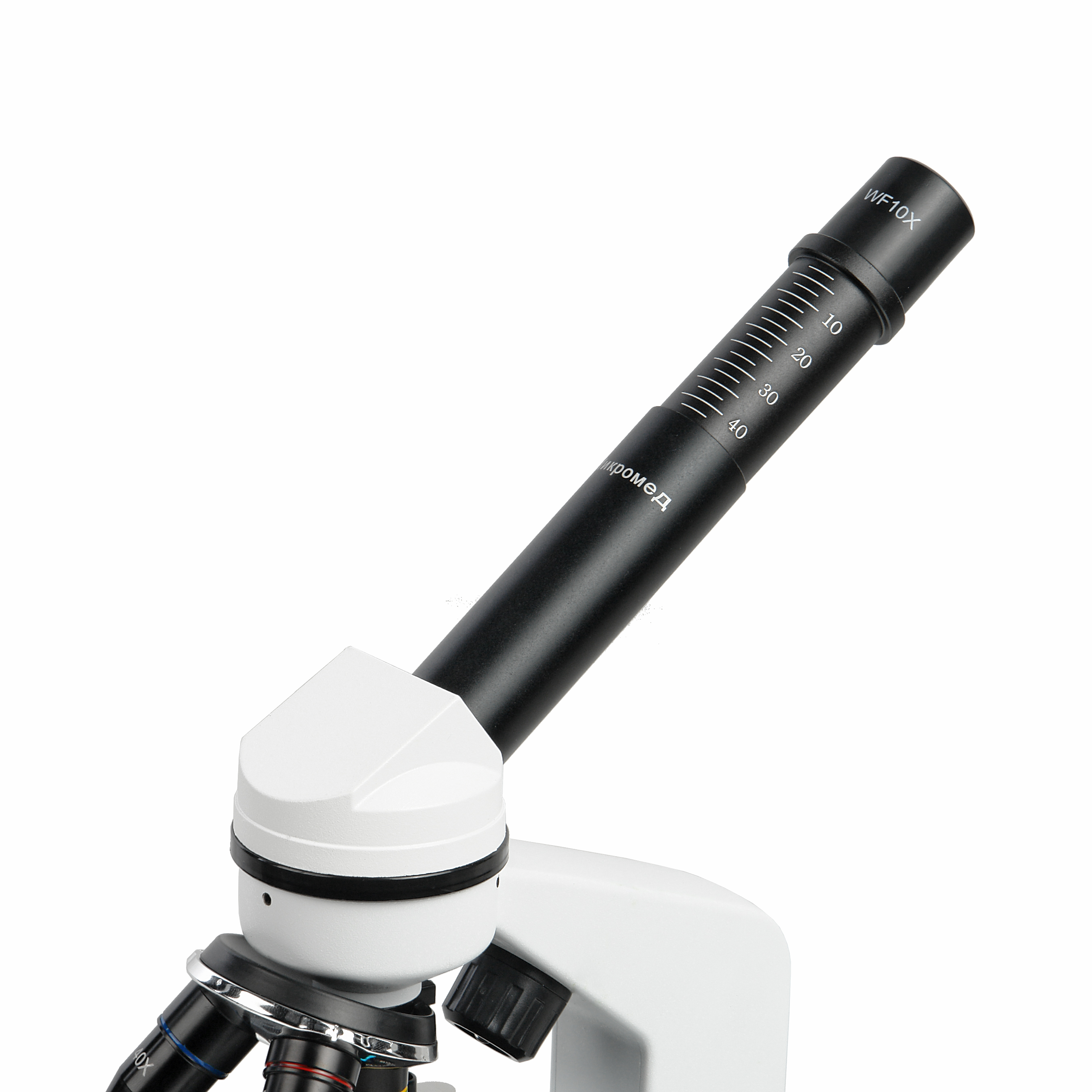 В комплекте микроскопа резкие ахроматические объективы 4x/0.10, 10x/0.25 и 40x/0.65, позволяющие наблюдать детальные и яркие изображения. Объектив 40x/0.65 имеет конструкцию оправы с подпружиненным оптическим блоком, что препятствует повреждению объектива и изучаемого образца. Все оптические элементы микроскопа - объективы и окуляры изготовлены из оптических стекол высокого качества и имеют просветляющее покрытие. Объективы микроскопа установлены на револьверном устройстве, что позволяет наблюдателю быстро переходить к исследованиям с различными увеличениями.