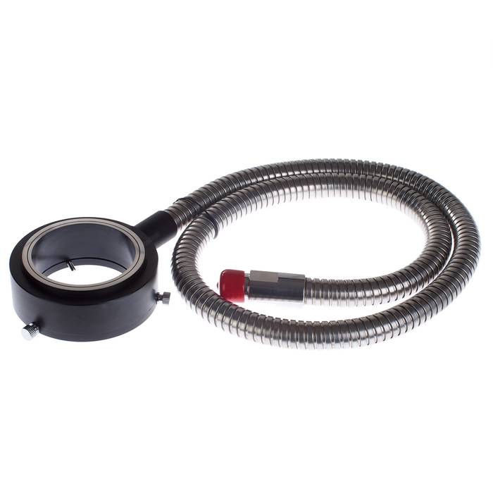 Кольцевой волоконный осветитель предназначен для освещения поля зрения стереомикроскопа «холодным белым» светом, передаваемым от галогенной лампы осветительного блока через гибкий светопроводящий жгут. Волоконный осветитель представляет собой многожильный стеклянный волновод, размещенный в гибком металлическом рукаве. Внутренний диаметр кольцевого осветителя – 55 мм.