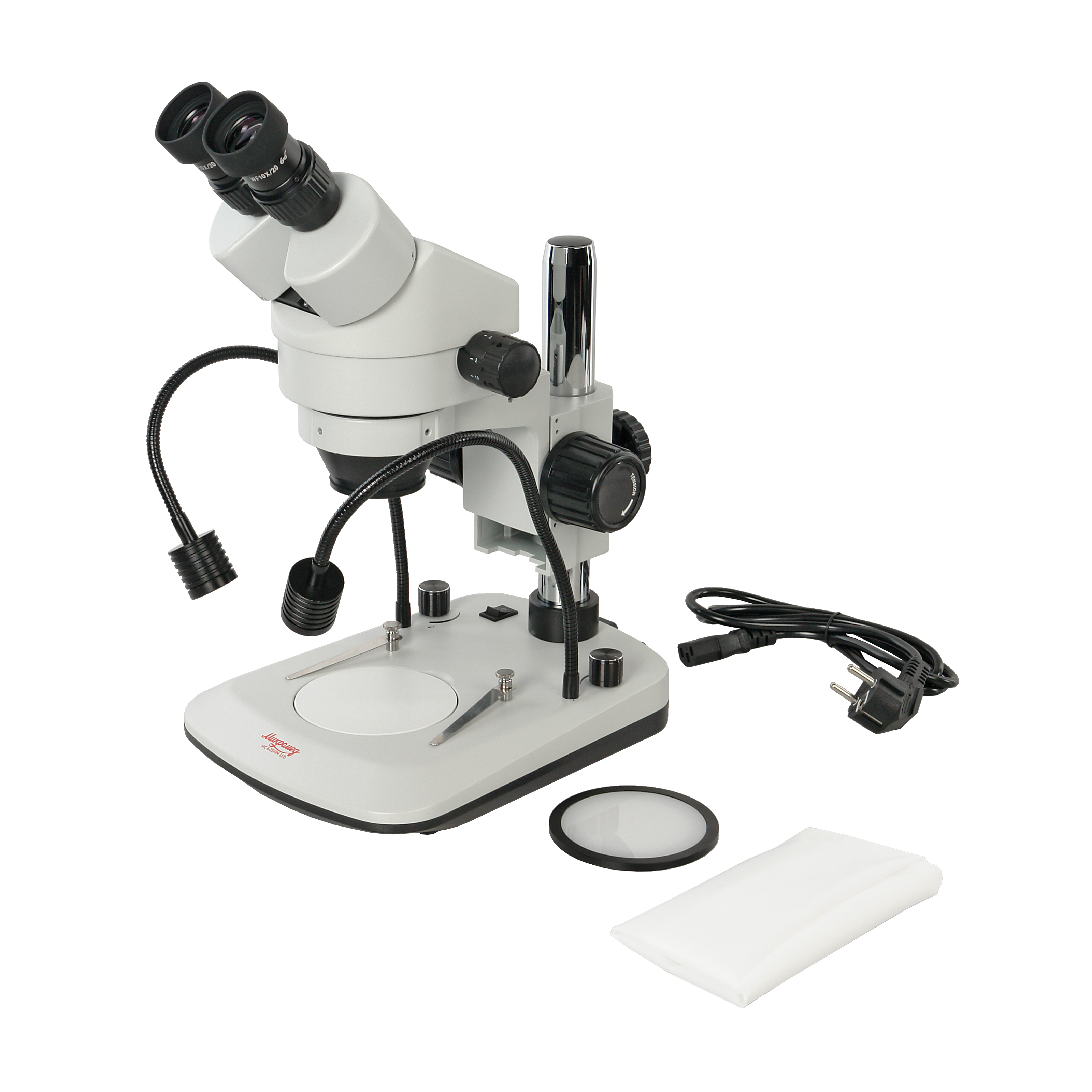 30513Стереомикроскоп с переменным увеличением от 7х до 45х. Рабочее расстояние 100 мм на всех увеличениях. Осветитель проходящего света и два осветителя отраженного света на гибких держателях.