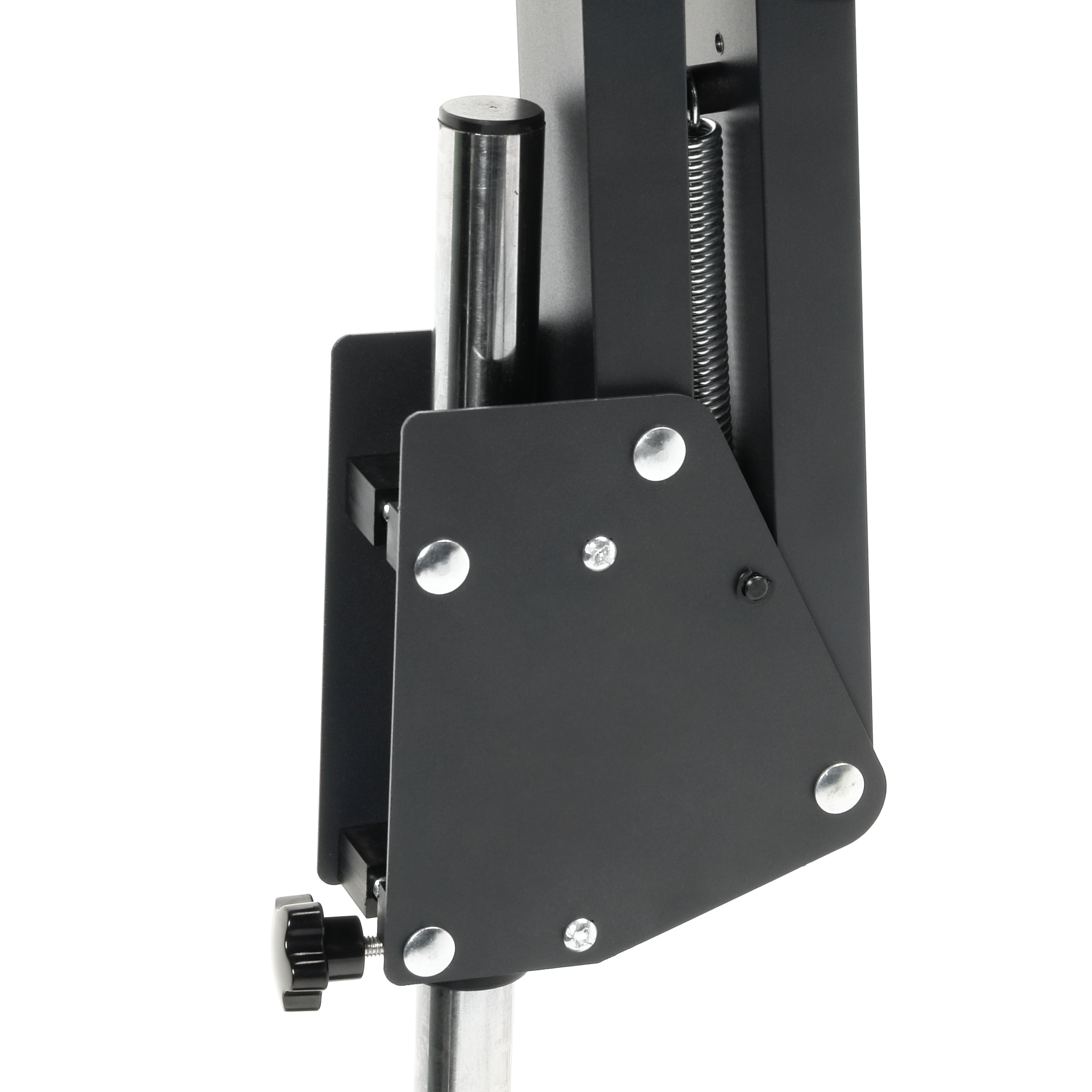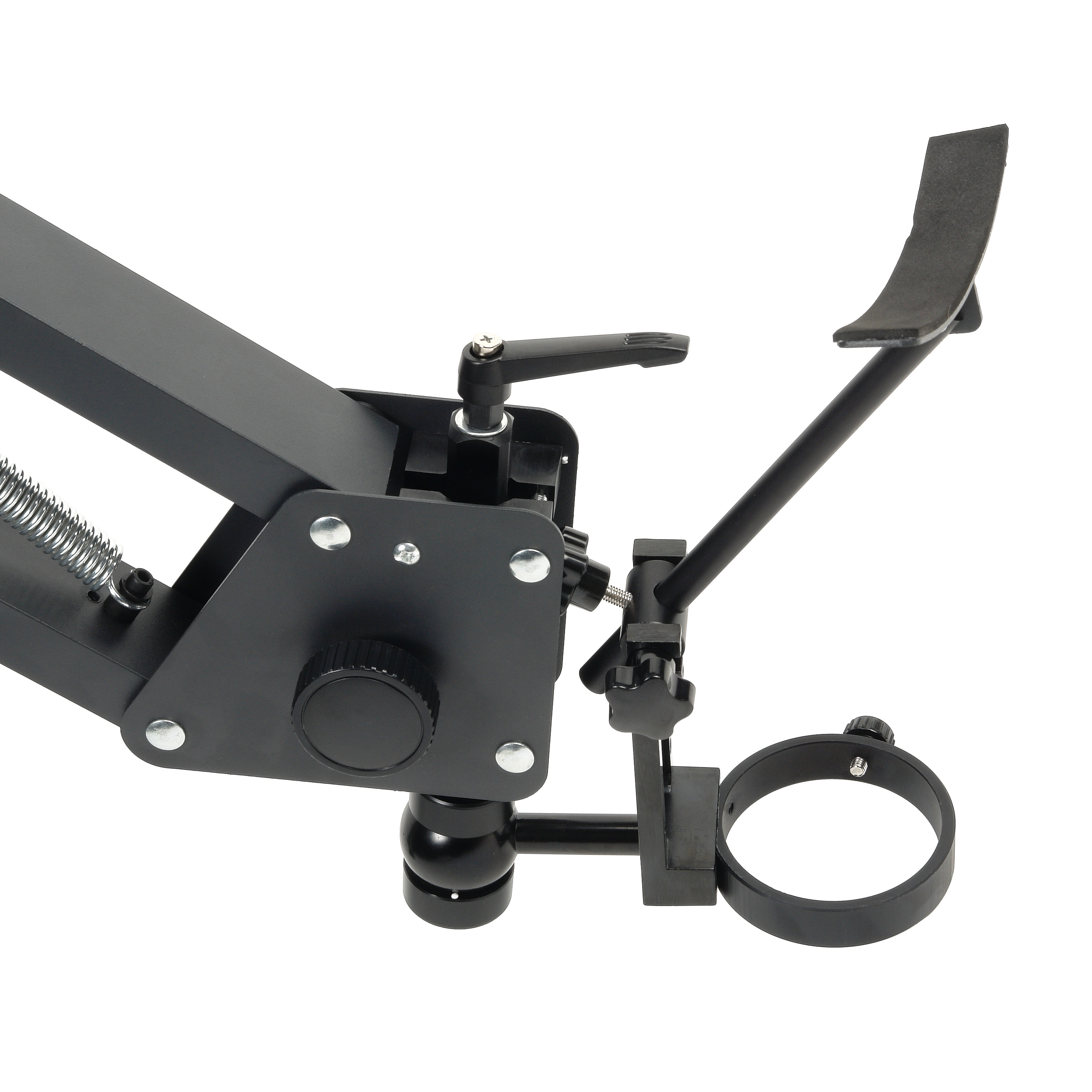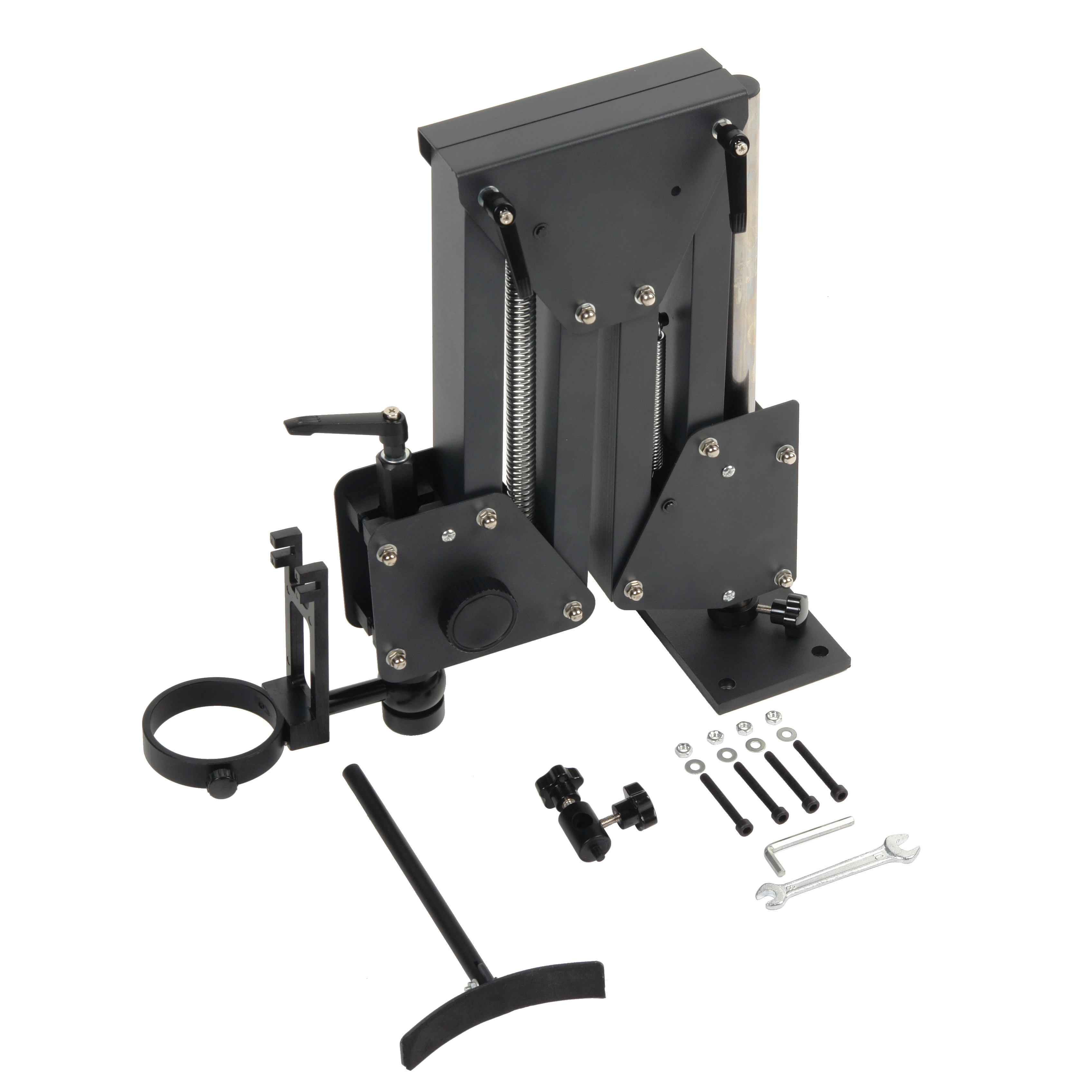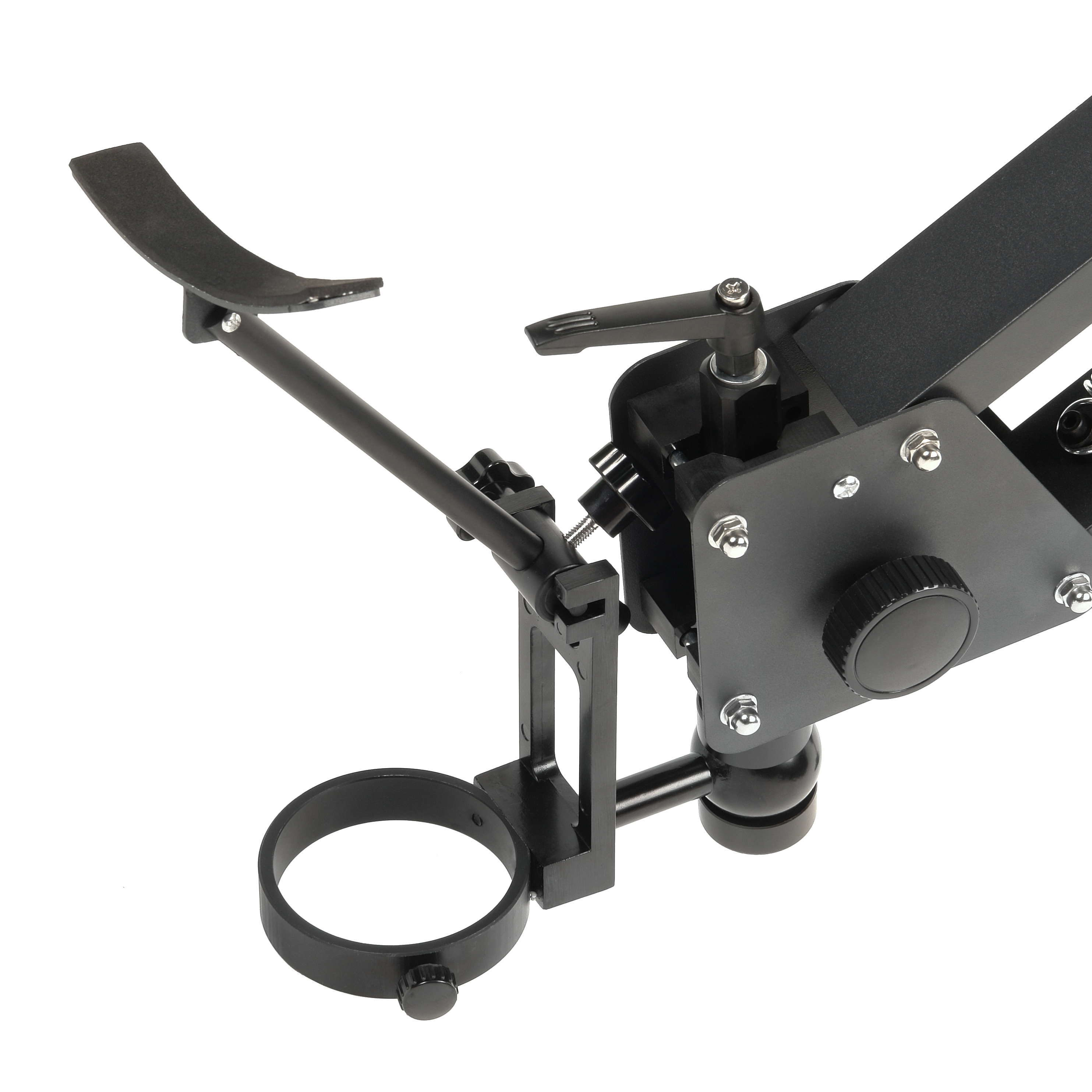 Перемещение оптической головки обеспечивается рычажным механизмом с пружинным противовесом, это позволяет настроить положение головки без лишних усилий. Рычаги имеют регулировку усилия перемещения и фиксатор. Конструкция механизма позволяет легко складывать штатив для минимизации пространства.