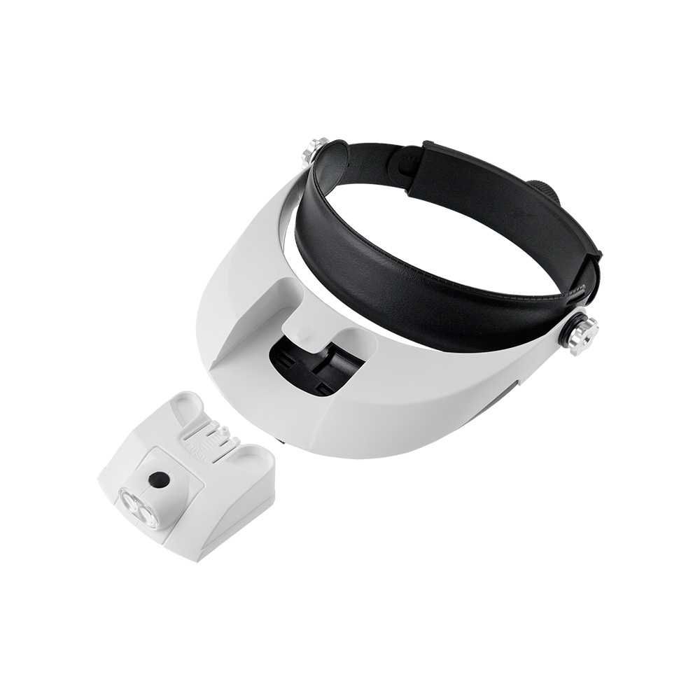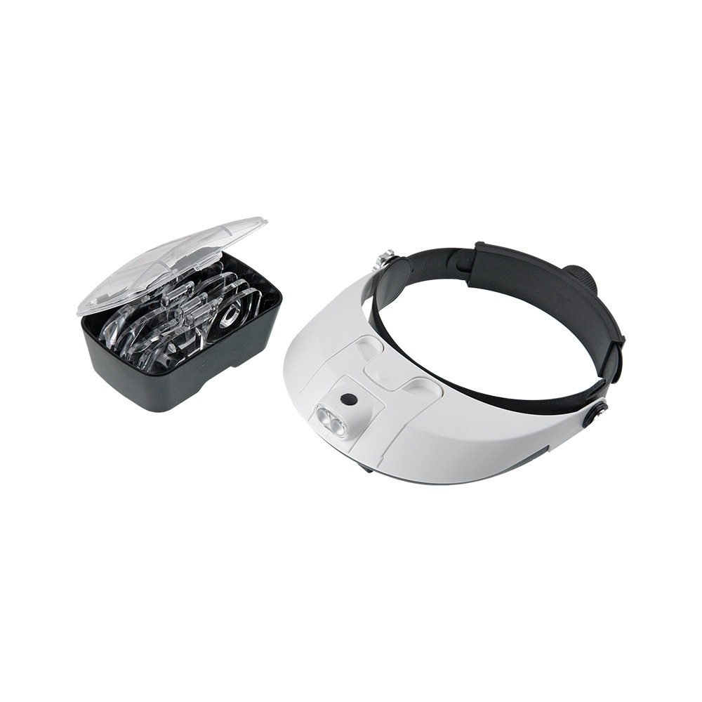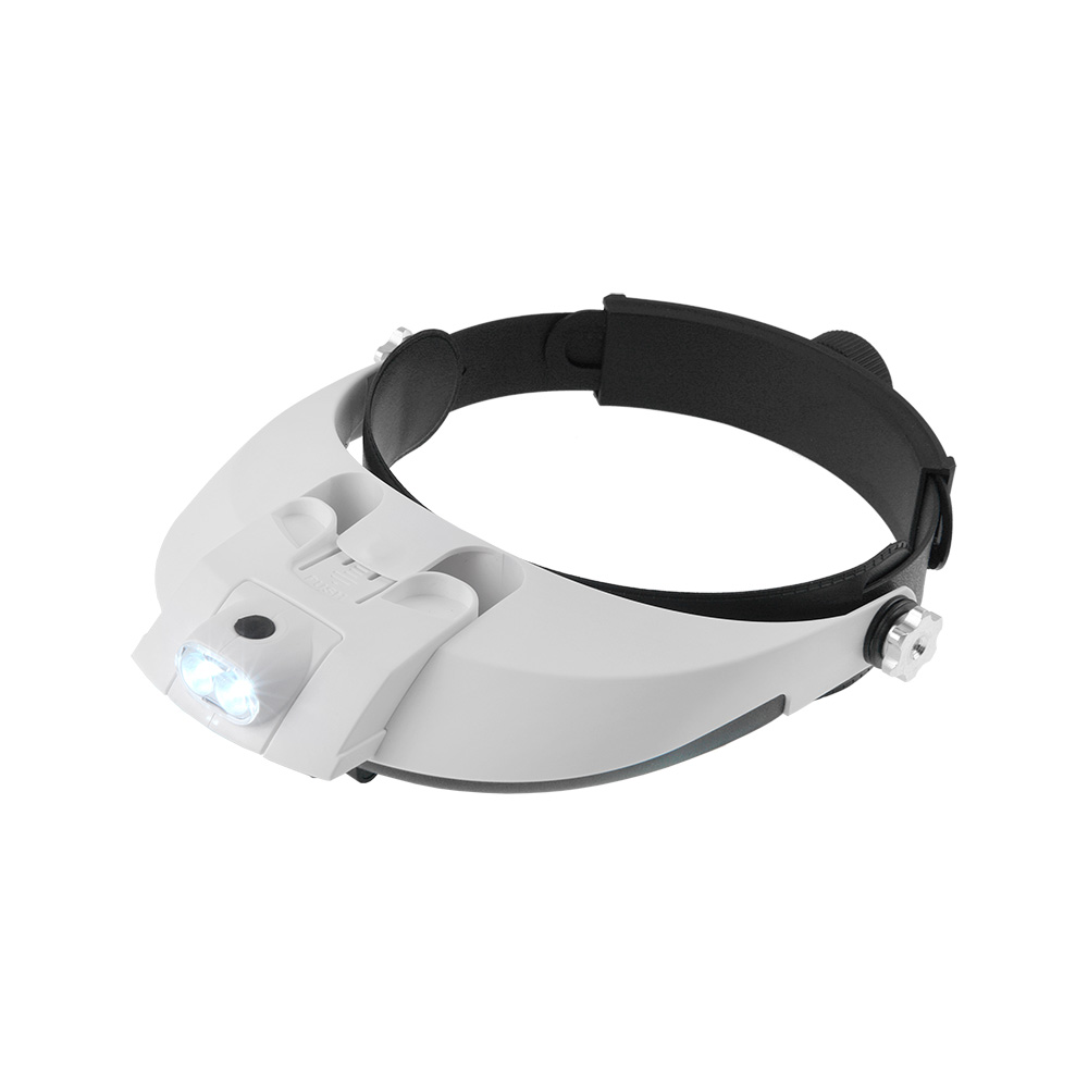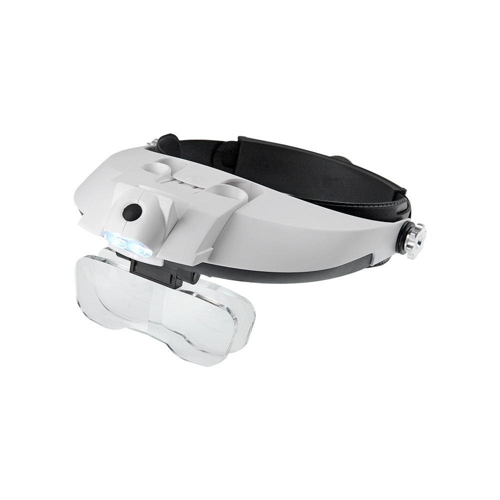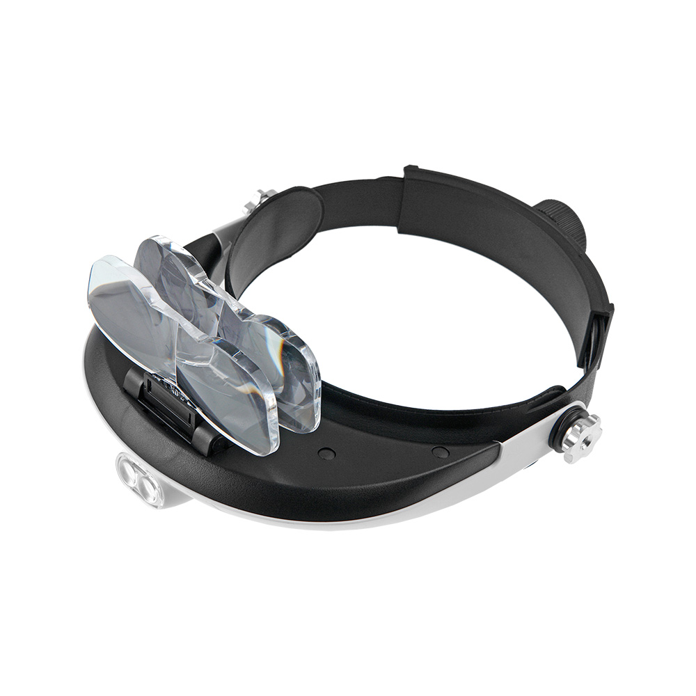 26202Налобная лупа-очки профессионального исполнения Veber 81001-G с мягким оголовьем и металлическими подпружиненными фиксаторами наклонного козырька. Сменные пары линз (1х, 1,5х, 2,0х, 2,5х, 3,5х ). Светодиодная подсветка, питание от 3 батареек ААА.
