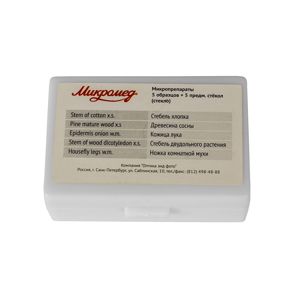 Набор состоит из пяти готовых микропрепаратов и пяти предметных стекол для самостоятельного изготовления препаратов.