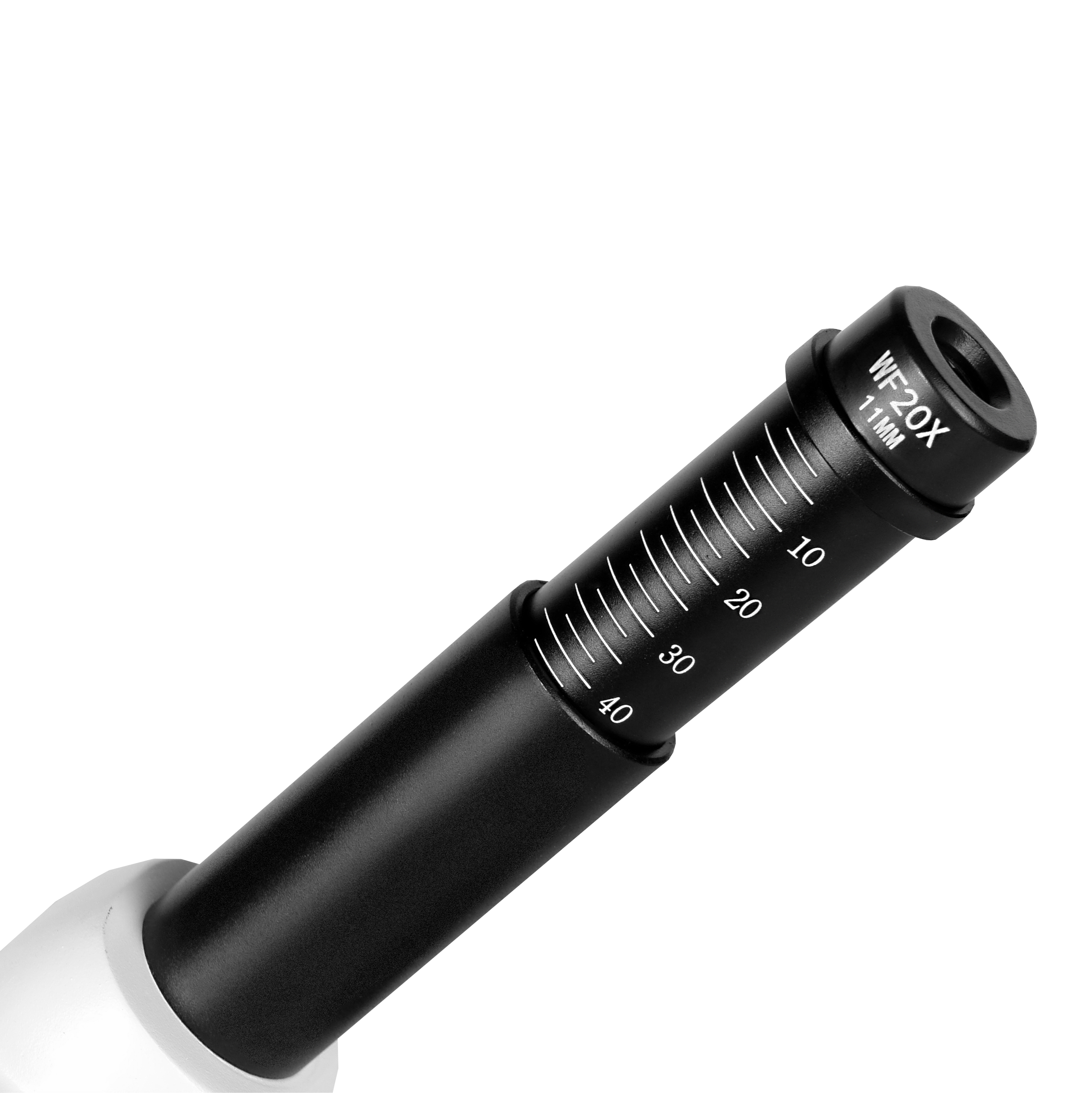 Окуляры широкого поля WF10х/15 и WF20/11, входящие в комплект, обеспечивают общее увеличение микроскопа от 40х до 2000х. При использовании комплектной линзы Барлоу максимальное увеличение может быть поднято до 4000х, окуляры в этом случае устанавливаются в оправу линзы. Линзу можно сдвигать вдоль оптической оси окулярного тубуса, плавно изменяя тем самым увеличение. Максимальное увеличение достигается с объективом 100х с иммерсией при полностью выдвинутой линзе. Без линзы для установки окуляров используется переходник, устанавливаемый в окулярный тубус. Дополнительно приобретаемые окуляры должны иметь установочный диаметр 23.2 мм, они устанавливаются непосредственно в окулярный тубус.