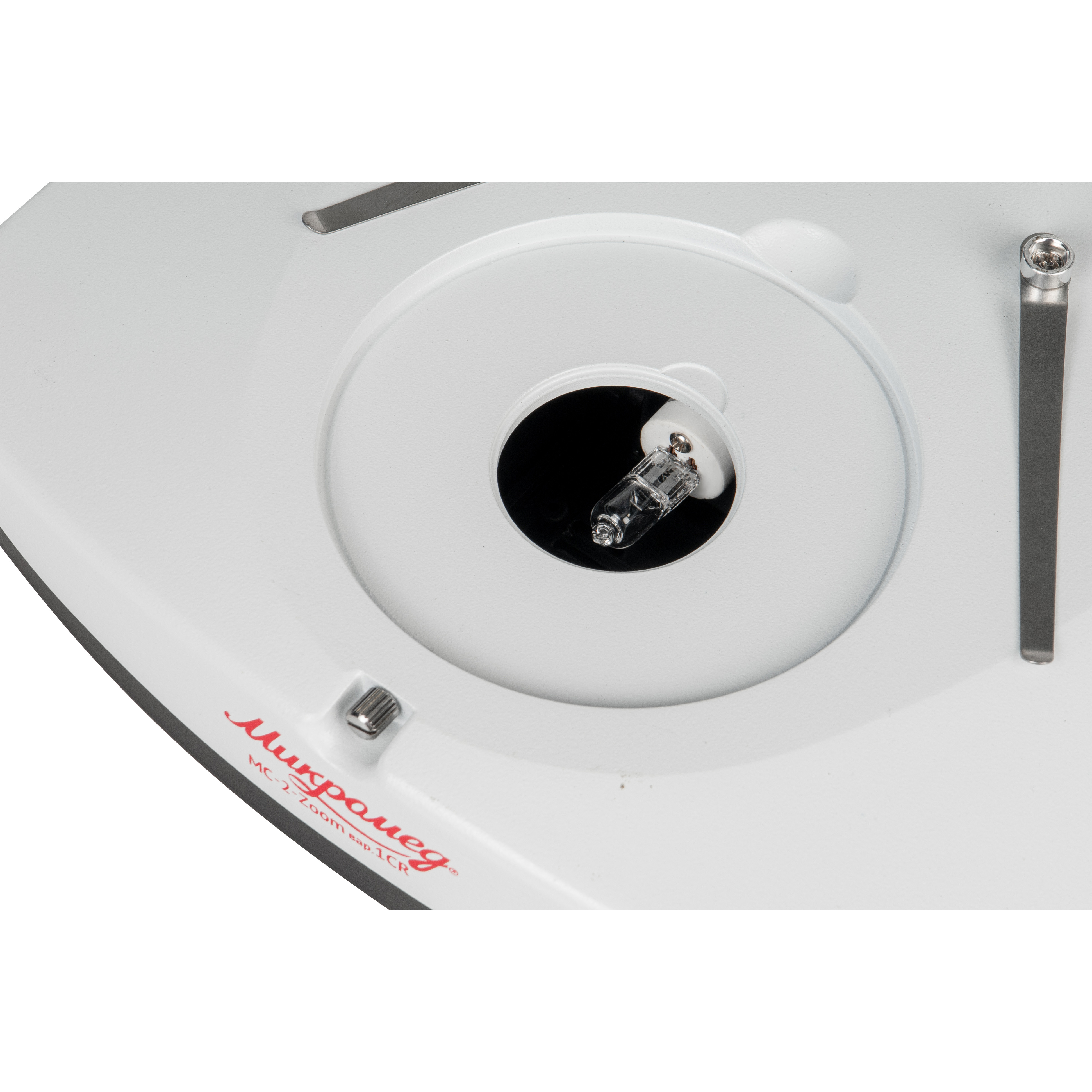 Исследования в отраженном свете проводятся с использованием встроенного осветителя. Осветитель расположен на подвижном кронштейне, позволяющем менять угол падения света для настройки освещения. В качестве источника света используется галогенная лампа 12 В / 10 Вт с рефлектором. Осветитель комплектуется синим конверсионным фильтром, предназначенным для повышения цветовой температуры галогенной лампы до значения, близкого к дневному свету. По дополнительному заказу микроскоп может быть укомплектован точечными светодиодными осветителями на гибких держателях и кольцевым бестеневым осветителем.