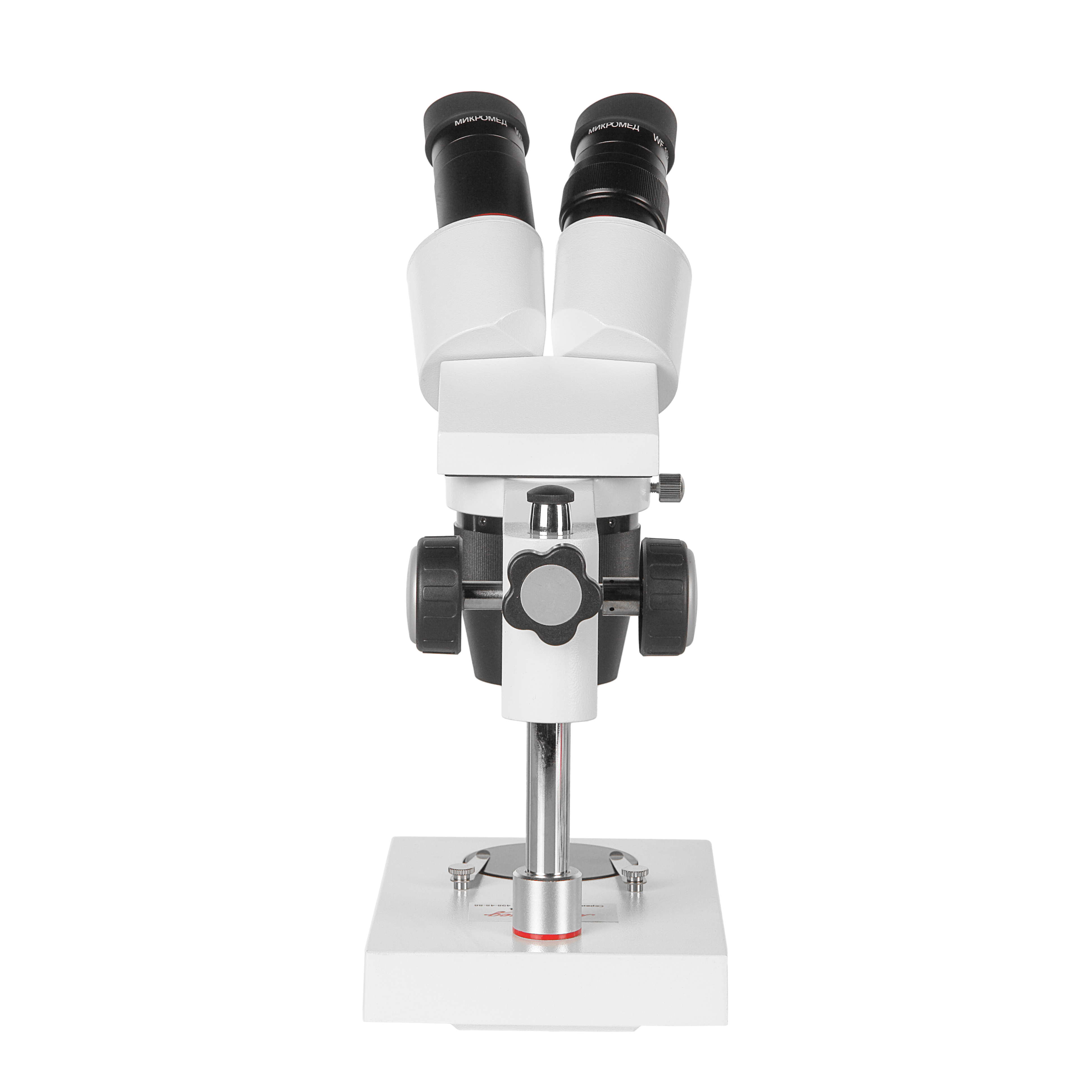 - Основание с предметной вставкой Ø60 мм с зажимами, штативной штангой и установленной оптической головкой с блоком объективов и окулярными тубусами