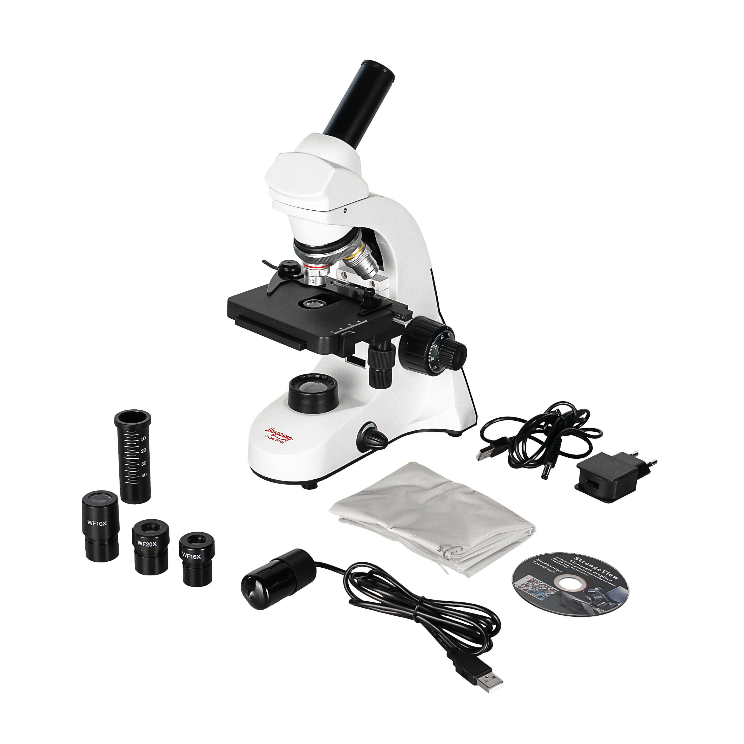В комплекте микроскопа исправленные объективы с увеличением 4х, 10х, 40х, окуляры WF 10х, WF 20х, WF 16х и линза Барлоу 2х. Объективы и окуляры обеспечивают общее увеличение микроскопа от 40х до 800х. Линза Барлоу применяется вместе с окуляром WF 16х и позволяет довести увеличение до 1280х.
