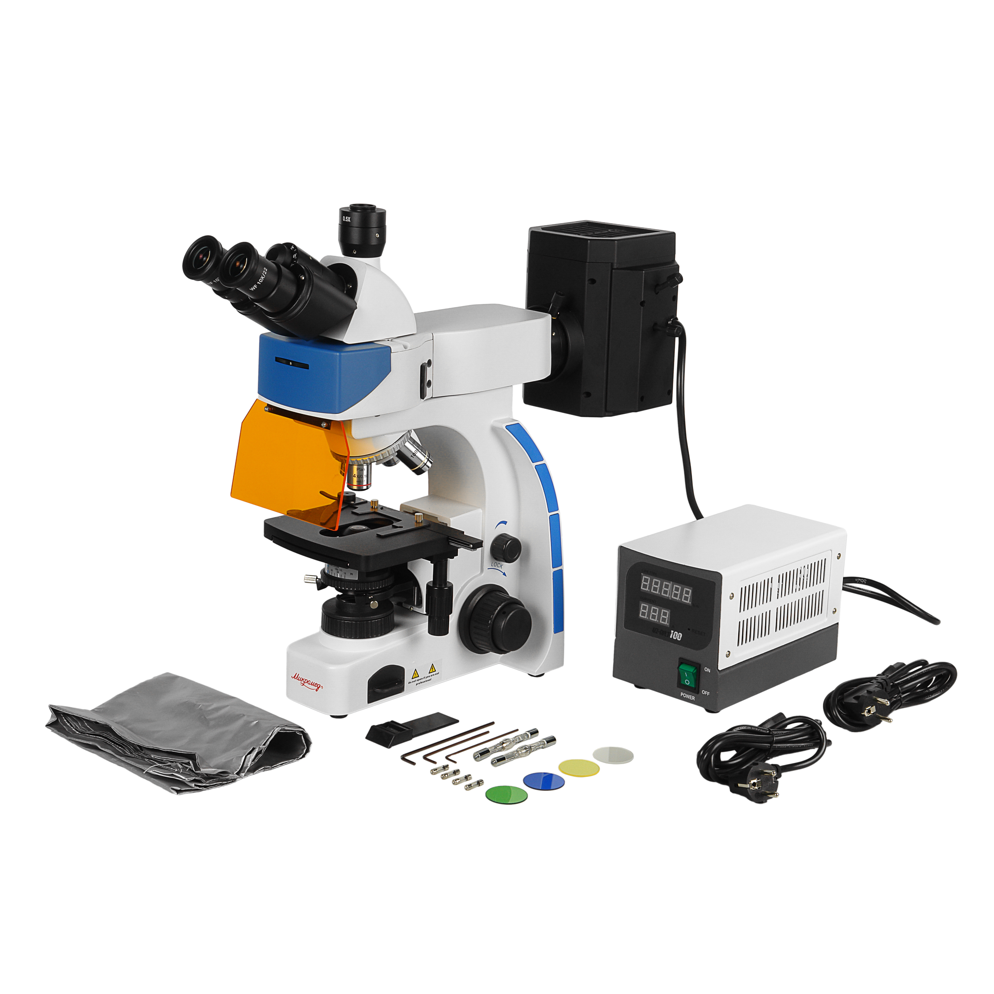 - Насадка флюоресцентная с фонарем ртутной лампы, c синим и зеленым фильтрами возбуждения, блоком питания и кабелями питания.