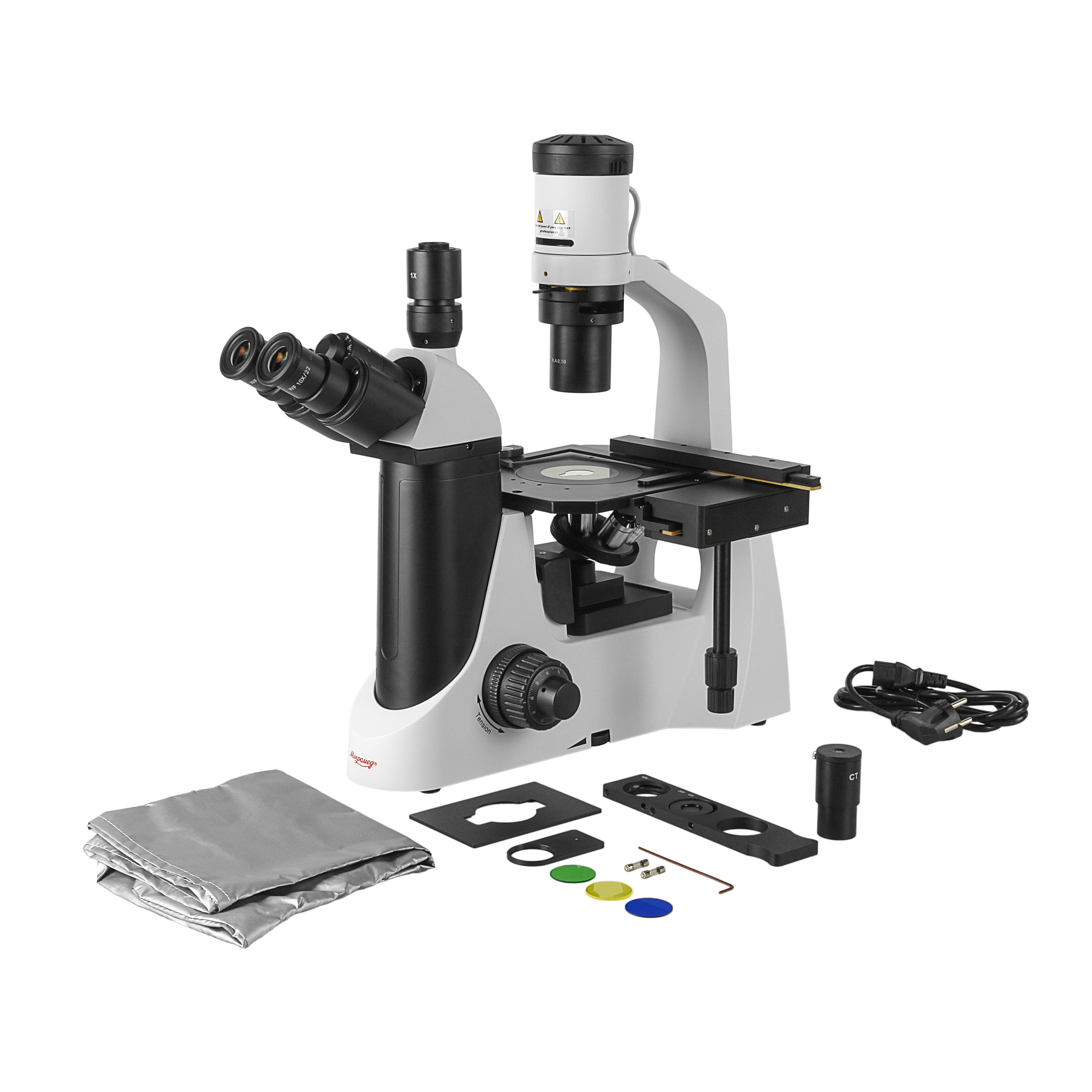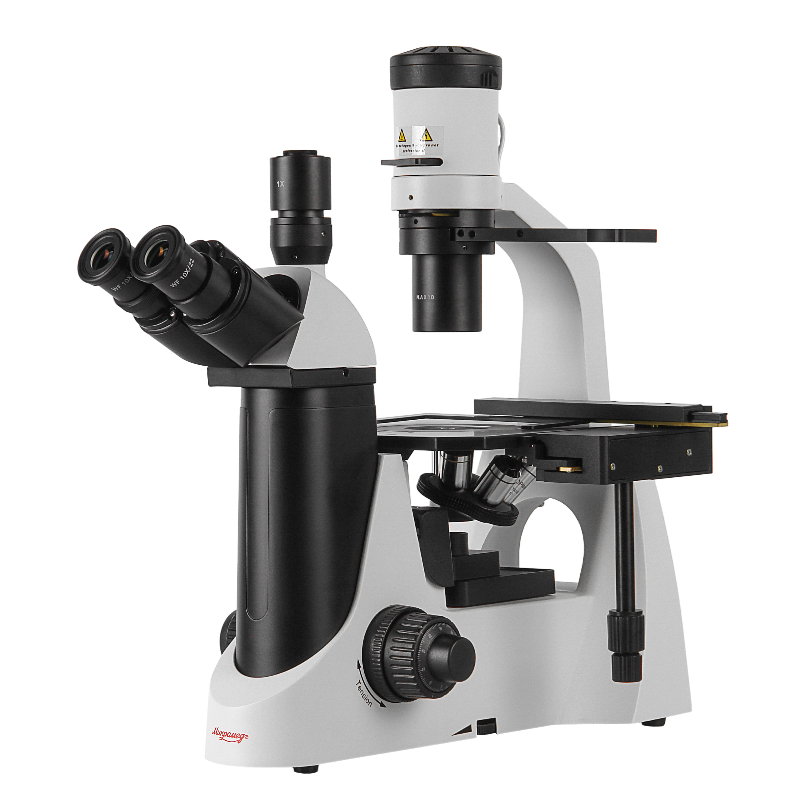 - Инвертированный штатив со встроенным в основание блоком питания, неподвижным предметным столиком, осветителем и механизмом фокусировки