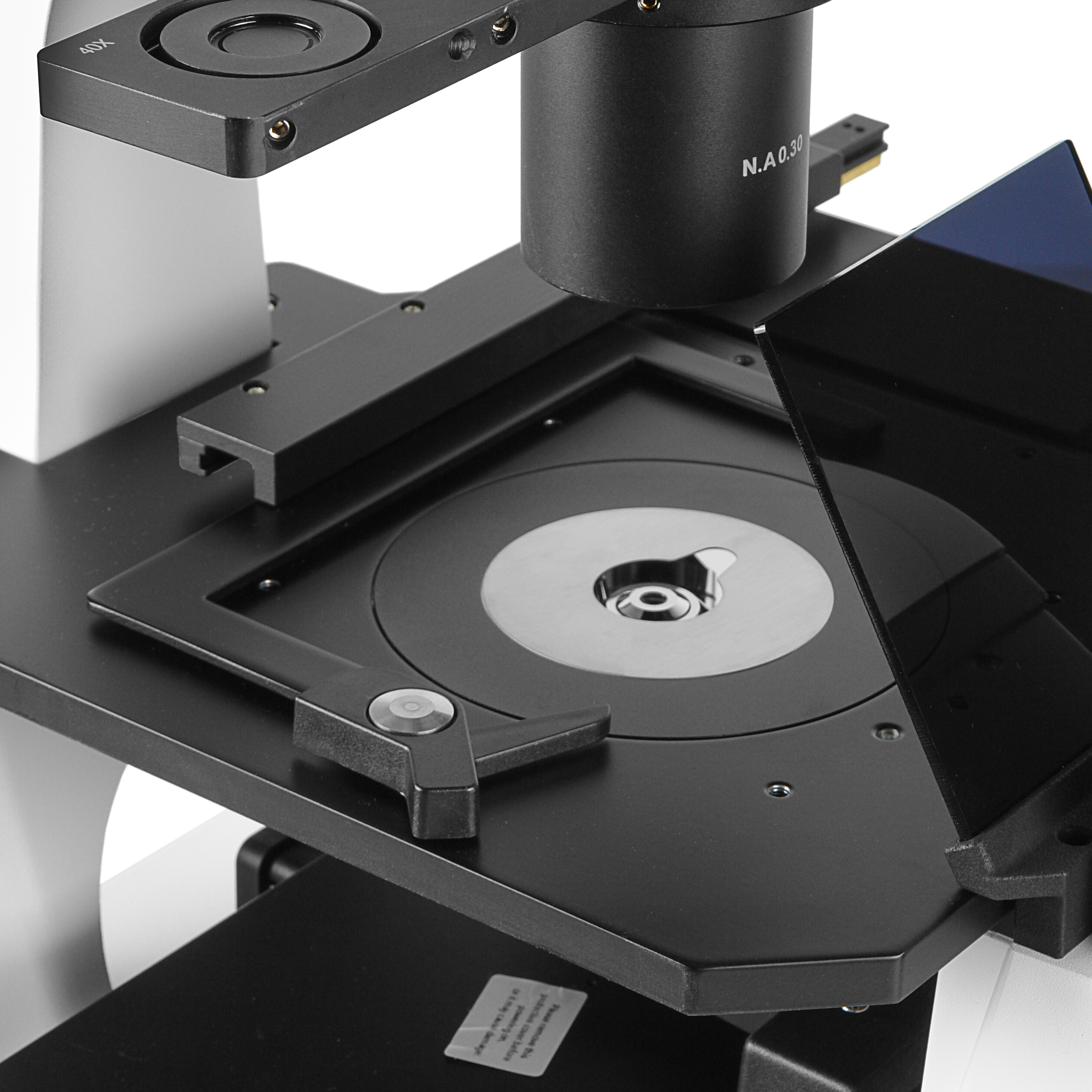 Микроскоп имеет инвертированное строение и оборудован неподвижным предметным столиком увеличенного размера 200х235 мм. Панель столика изготовлена из твердого алюминиевого сплава толщиной 10 мм и предназначена для размещения крупных объектов массой до 5 кг. В комплекте микроскопа металлические предметные вставки – круглая Ø110 и прямоугольная 128х86 мм. Столик комплектуется съемным механическим препаратоводителем обеспечивающим перемещение объекта в направлениях X и Y в диапазоне 120-80 мм. Перемещение осуществляется зубчато-реечными приводами с управлением коаксиальными рукоятками.