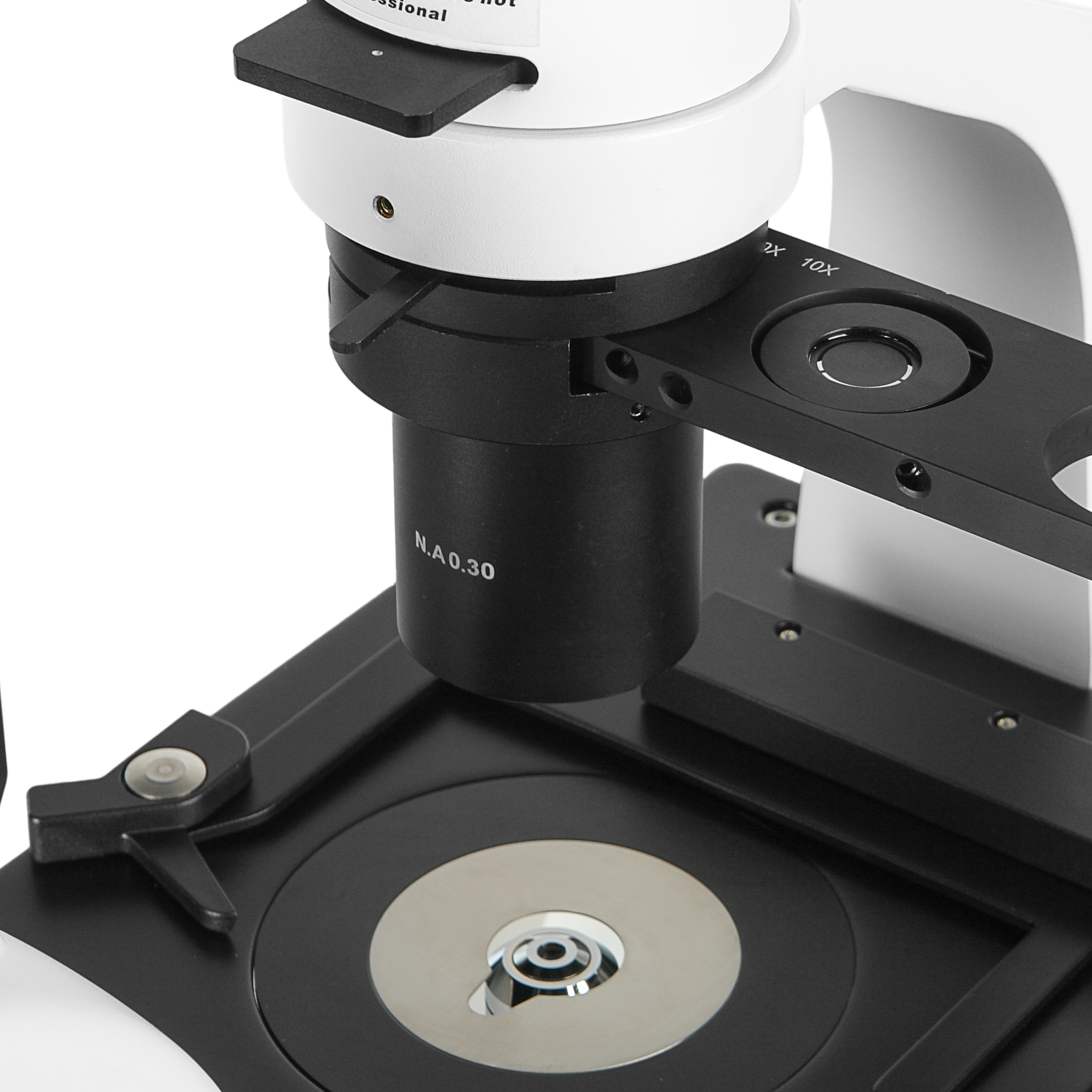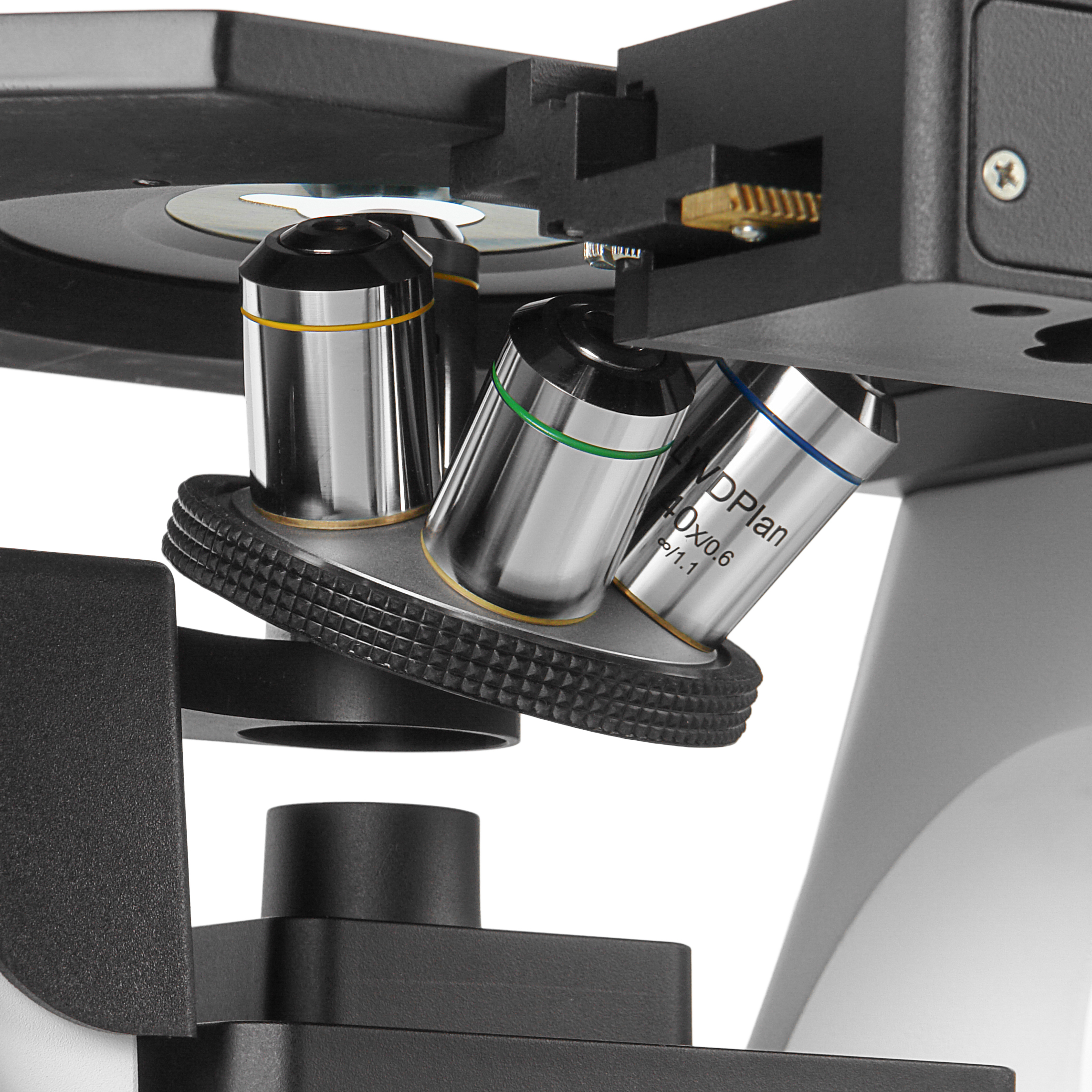 Объективы имеют увеличенное рабочее расстояние и допускают исследования в лабораторной посуде с толщиной дна до 1.1 мм. На оптические детали нанесено многослойное антирефлексное и антигрибковое покрытие позволяющее без ограничений использовать микроскоп в биологических лабораториях. Объективы микроскопа установлены на револьверном устройстве, рассчитанном на 5 объективов.