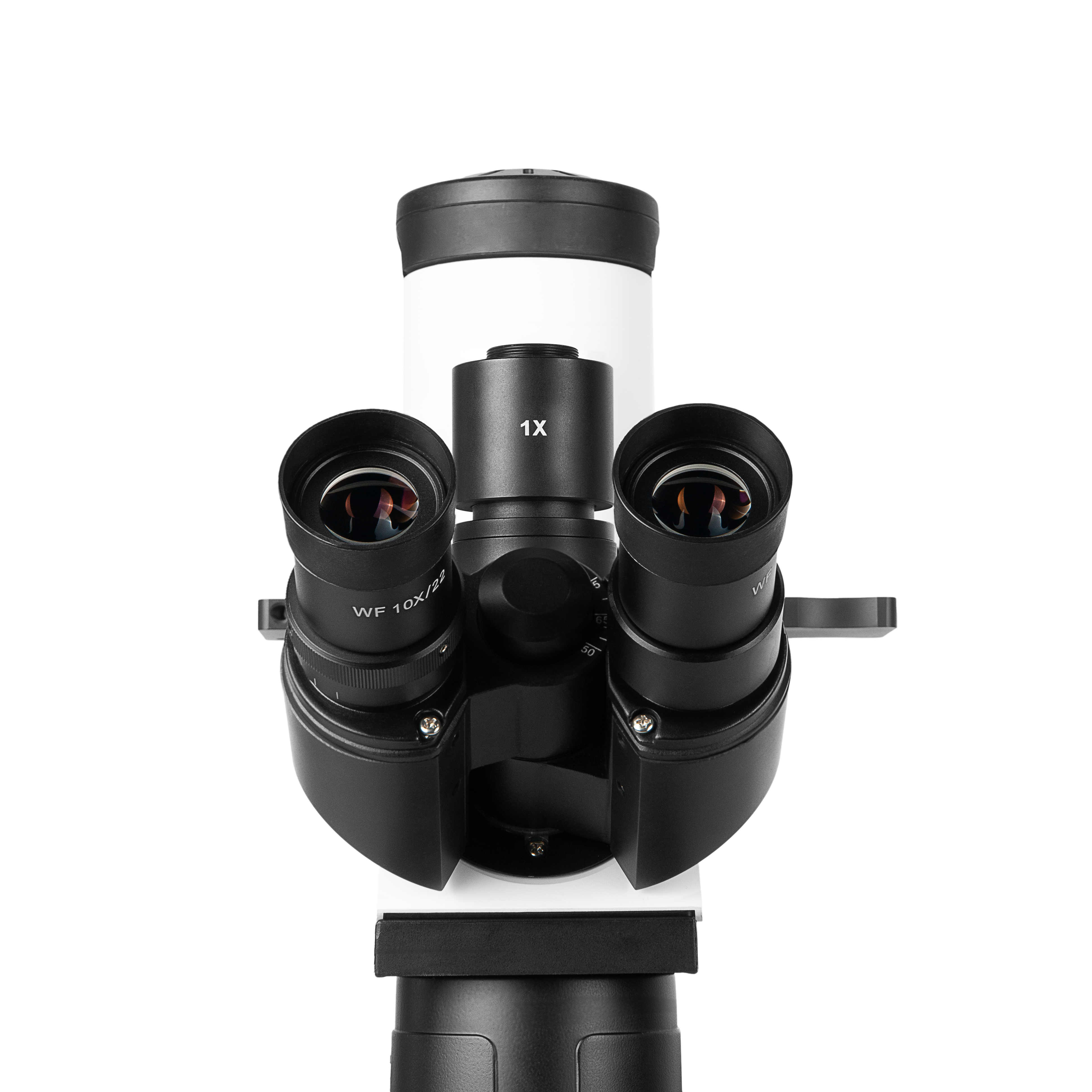 Тринокулярная визуальная насадка микроскопа снабжена окулярными тубусами с наклоном 30°, что способствует комфортной работе на микроскопе и снижает нагрузку на шейный отдел позвоночника исследователя. Для компенсации аметропии глаз левый окулярный тубус снабжен механизмом диоптрийной настройки в диапазоне ±5 дптр. Благодаря конструкции Зидентопфа насадка допускает настройку межзрачкового расстояния разворотом окулярных тубусов в пределах 50-75 мм без потери точной фокусировки.