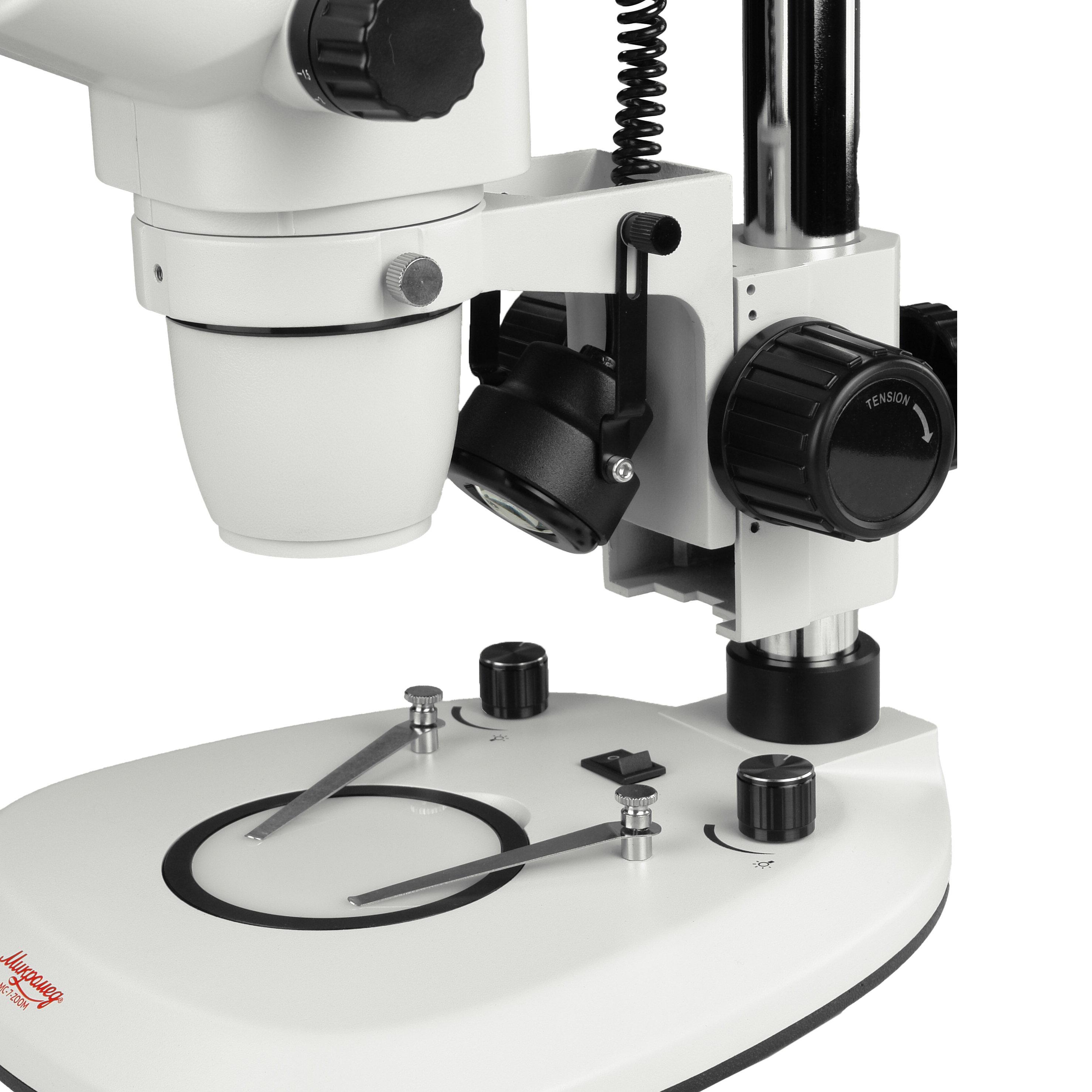 Объективы микроскопа имеют переменное увеличение, плавно изменяемое от 0,67х до 4,5х. Для наблюдения стереоскопического трехмерного изображения применяется пара одинаковых объективов, установленных под углом к плоскости исследуемого объекта. Благодаря их оптической конструкции с исправленными аберрациями достигается высокая резкость и яркость изображения во всем диапазоне увеличений. Конструкция объективов позволяет сохранять точную фокусировку микроскопа вне зависимости от установленного значения увеличения, как при наблюдении в окуляры, так и при записи с помощью камеры.