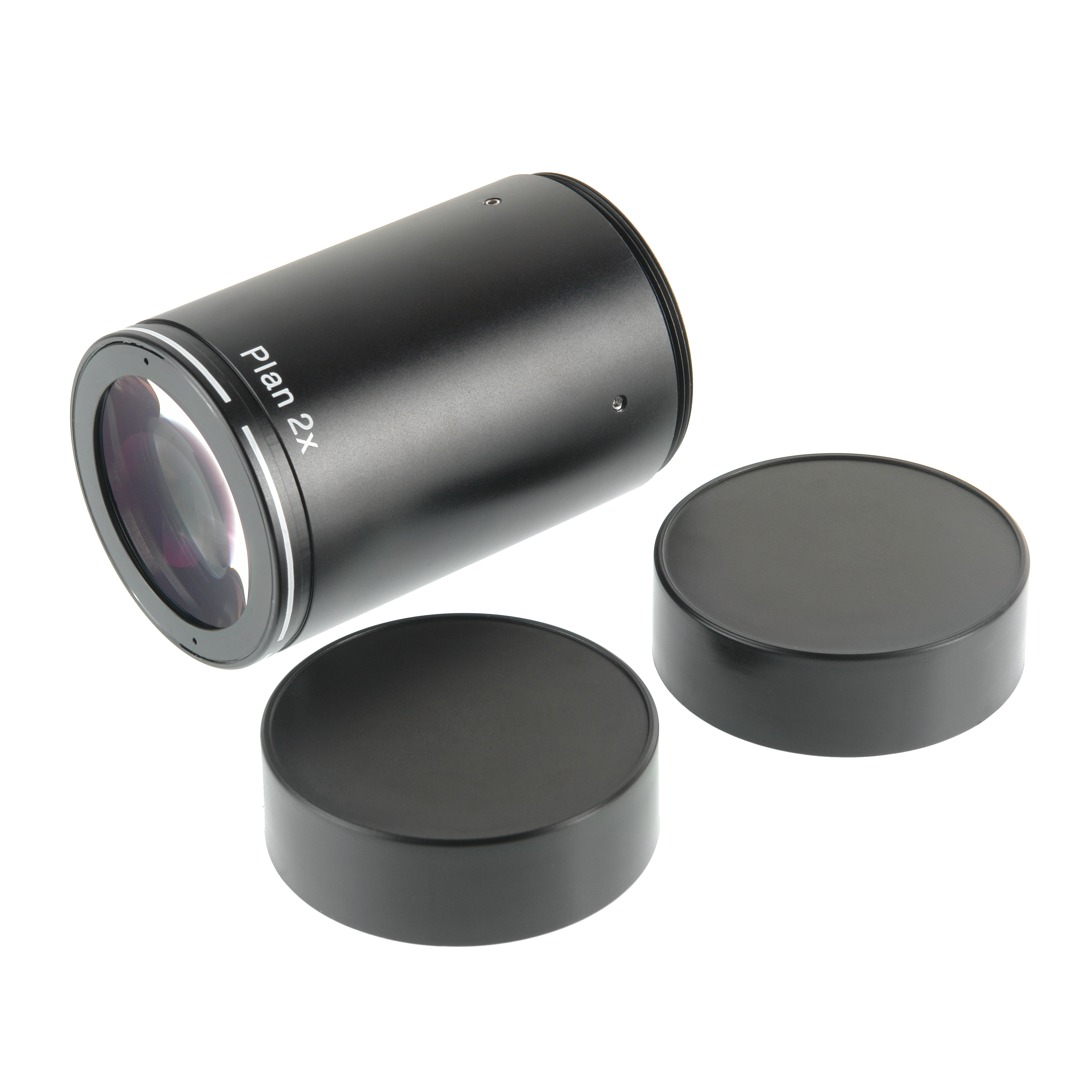 Объектив Plan 2x имеет большой диаметр для обеспечения стереоскопичности, создаваемой углом 12⁰ между лучами, проходящими через периферические участки линз. Благодаря исправленным хроматическим аберрациям, кривизне поля и сферической аберрации объектив создает плоское изображение с высоким разрешением без потерь информативности на краях поля.