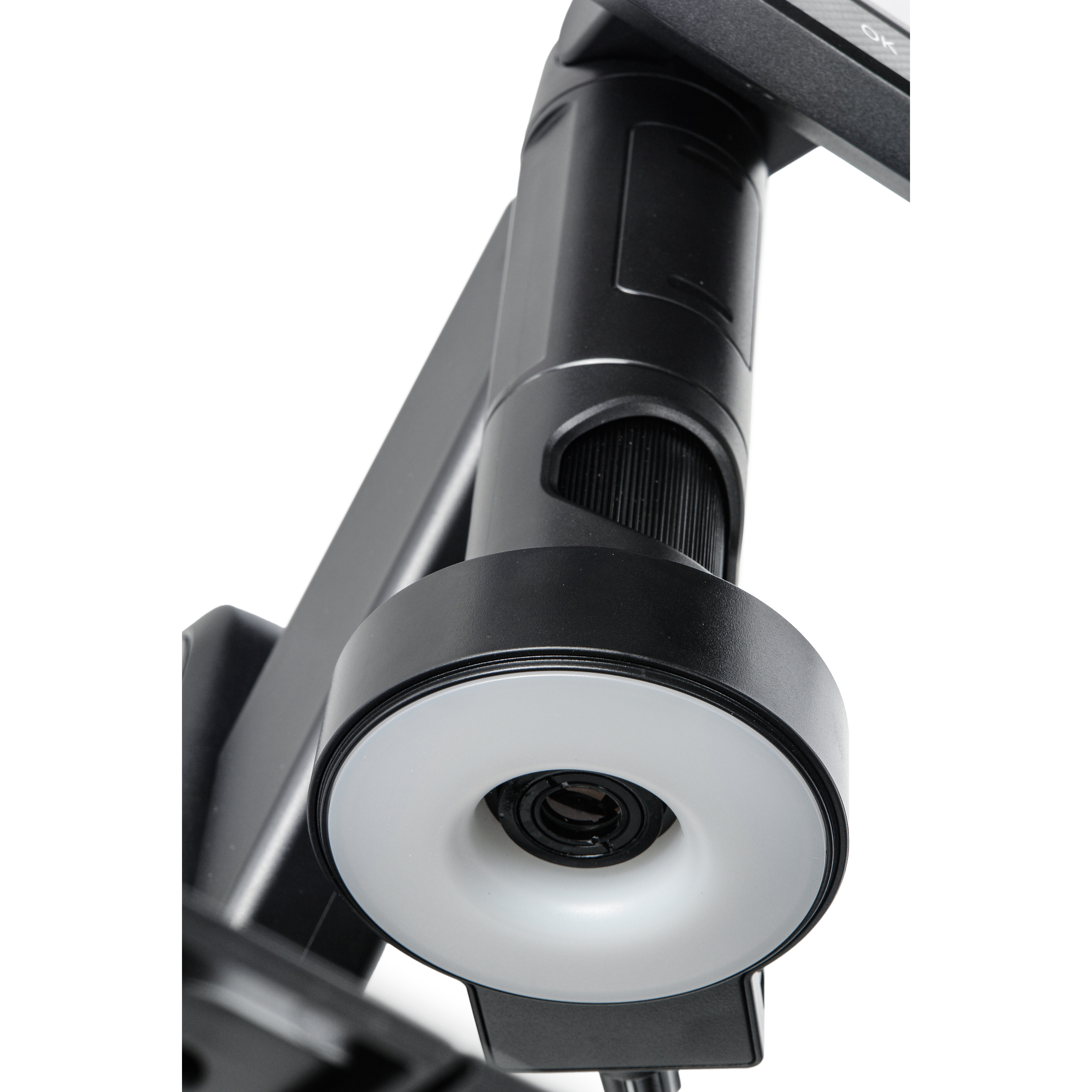 Кольцевой осветитель микроскопа позволяет исследовать непрозрачные и полупрозрачные объекты в отраженном свете. В осветителе используется 30 светодиодов со спектром излучения близким к дневному свету. Подобный свет способствует правильной цветопередаче и точной автоматической настройке WB. Светодиоды расположены по кольцу вокруг объектива и благодаря такой конфигурации достигается равномерное освещение объекта без ассиметричных косых теней препятствующих проведению точных измерений размеров объекта и получению ложных результатов исследований. Осветитель имеет бесступенчатую регулировку яркости, она производится рукояткой на корпусе осветителя. Питание светодиодов, также, как камеры и монитора, осуществляется от встроенного аккумулятора. Осветитель оснащен защитным рассеивающим стеклом, повышающим равномерность освещения.