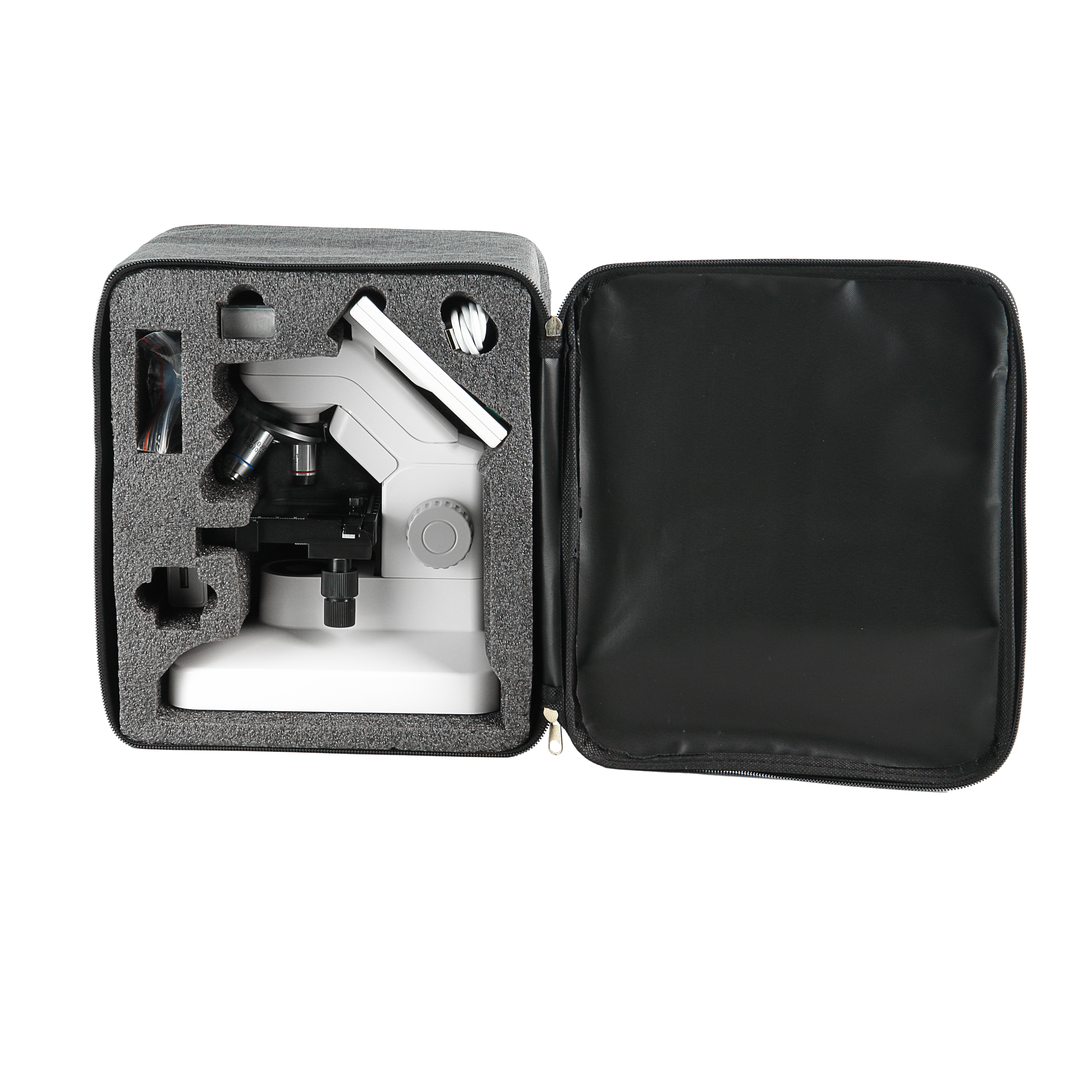 Микроскоп состоит из оптической головки с объективами на револьверном устройстве, светодиодными осветителями проходящего и отраженного света, механизмом фокусировки и LED монитором 7”. На штативе микроскопа установлен механический предметный столик. Все, что требуется сделать после приобретения, это распаковать микроскоп и можно начинать исследования.