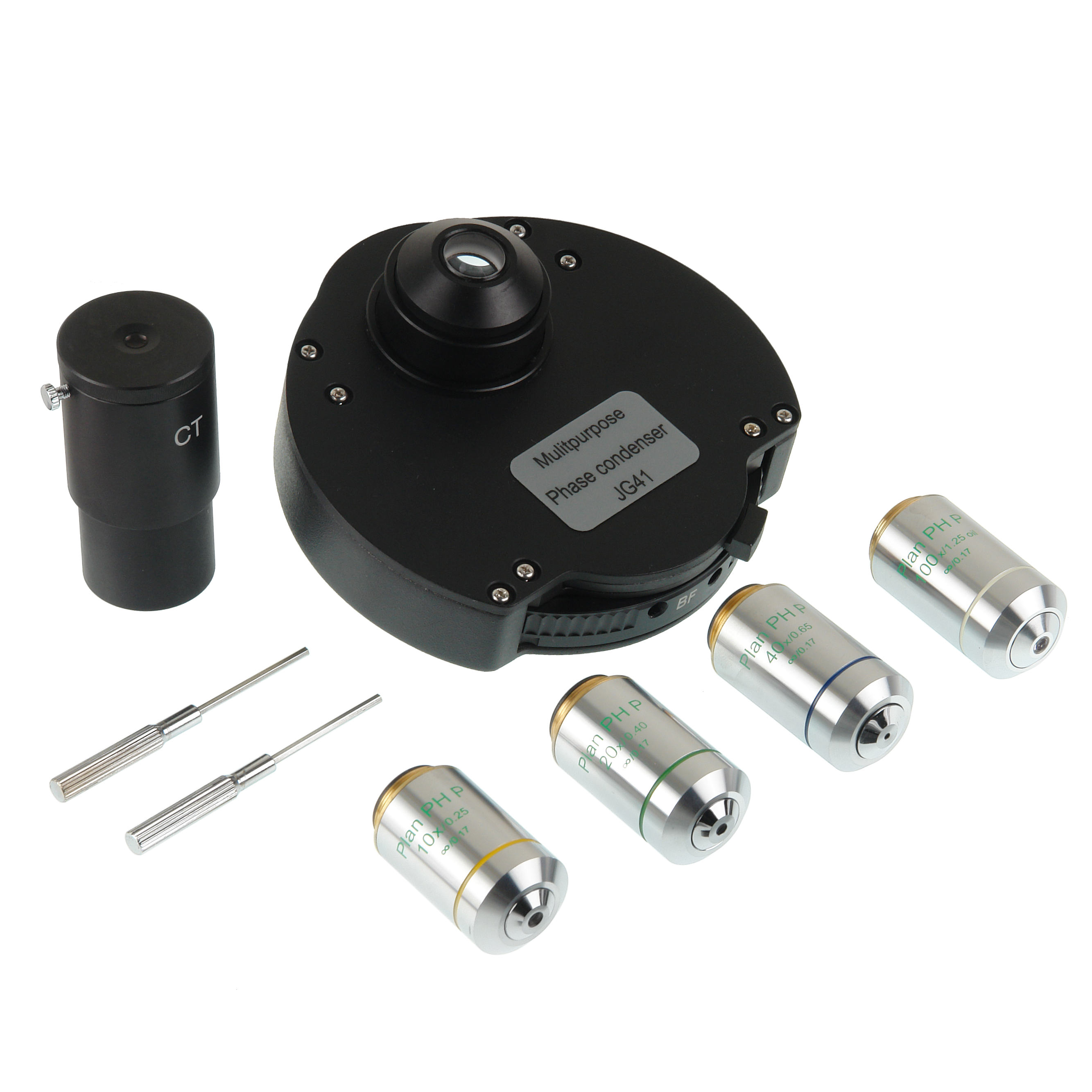 В комплект входят фазовые объективы-планахроматы 10х/0,25; 20х/0,40; 40х/0,66; 100х/1,25. Объективы рассчитаны на длину тубуса "бесконечность" и толщину покровного стекла 0,17 мм
