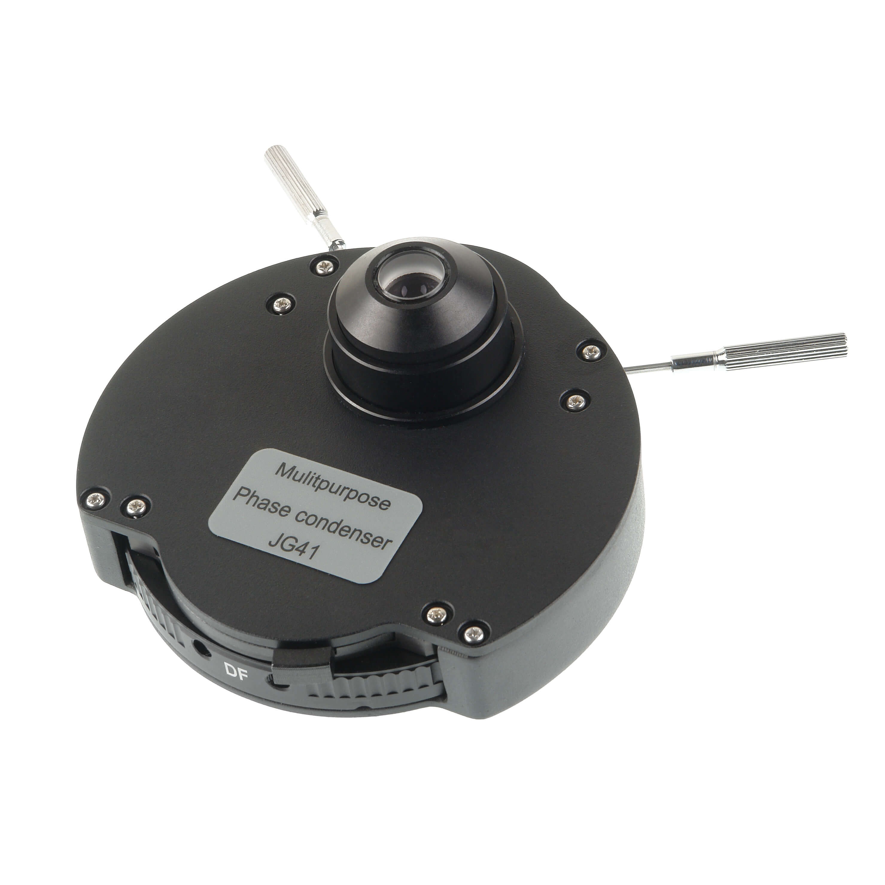 Фазовый конденсор вставляется в кольцо кронштейна конденсора микроскопа вместо обычного светлопольного конденсора и зажимается винтом обычным способом.