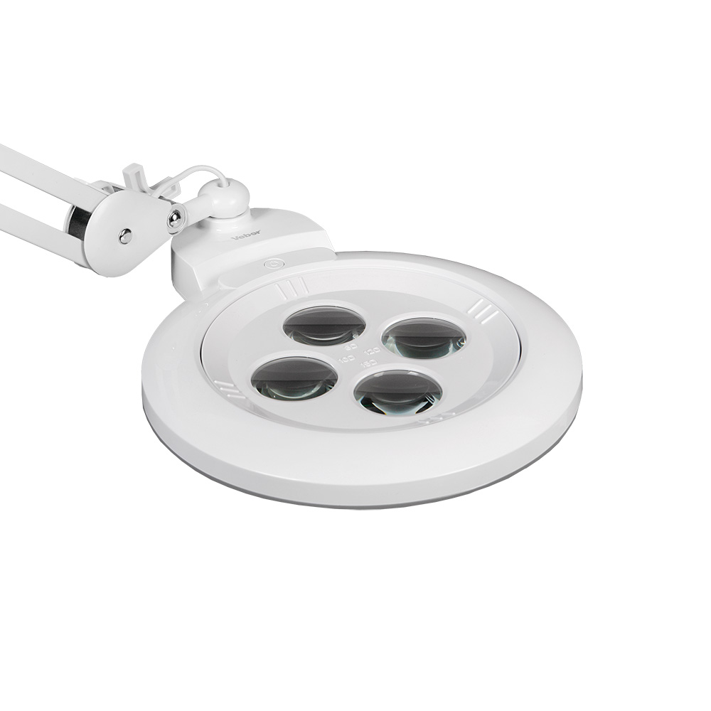 Конструкция лупы-лампы Veber 8608D LED Bi-color предусматривает возможность смены кратности увеличения изображения за счет использования сменных обойм с линзами. Всего в комплекте две таких обоймы: обойма с большой 3-х кратной (Ø 144 мм) и наклеенной сверху на нее 20-кратной линзой (Ø 23 мм) и обойма с четырьмя линзами (Ø 47 мм каждая) кратностью 8х, 10х, 12х и 15х. Оперативно сменить обойму с линзами не составляет труда — ее крепление в кольце имеет байонетный тип.
