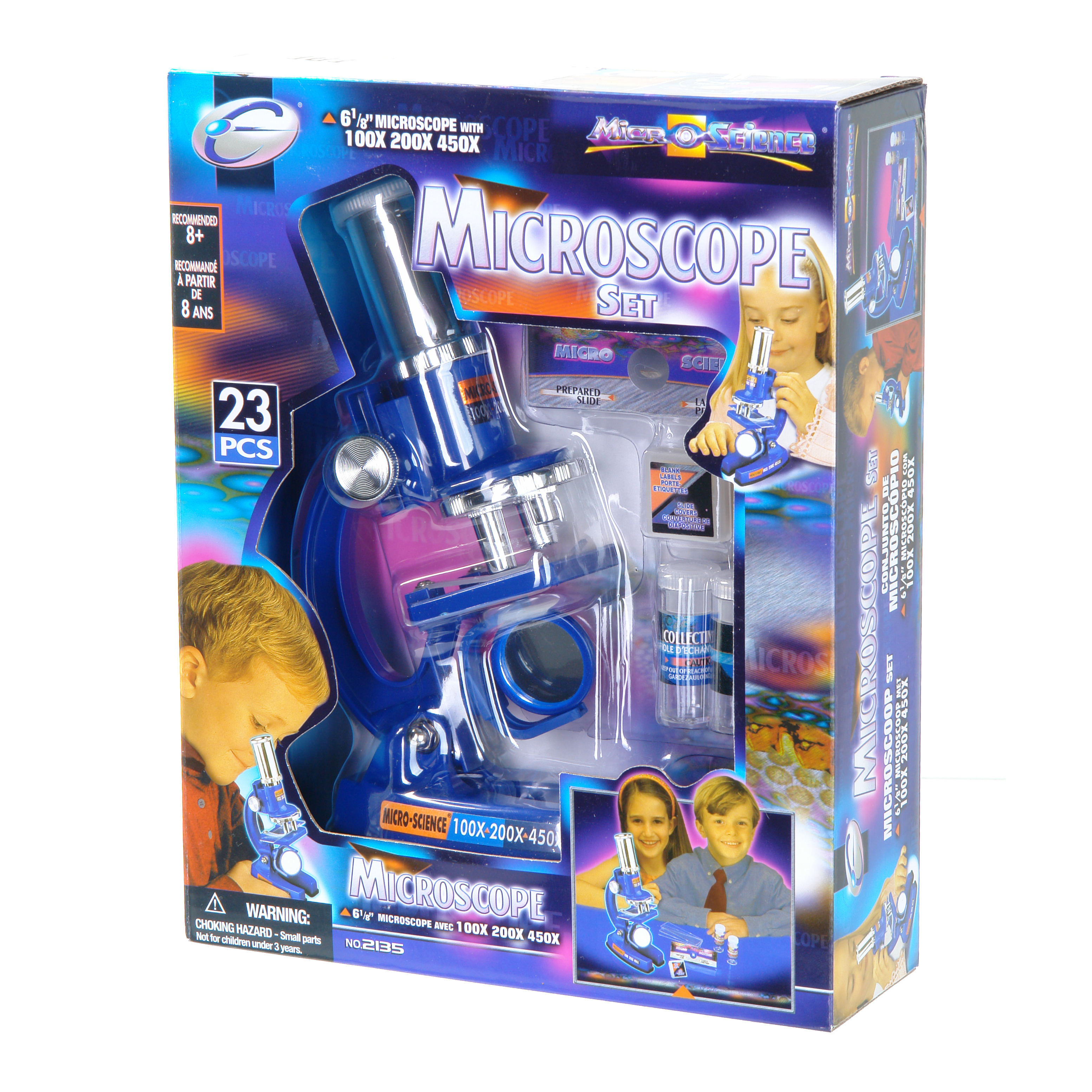 25607Монокуляр. Увеличение 100х-450х. 3 объектива. Источник света – лампа, зеркало. Подготовленный микропрепарат в комплекте. 4 чистых предметных и покровных стекла со стикерами.