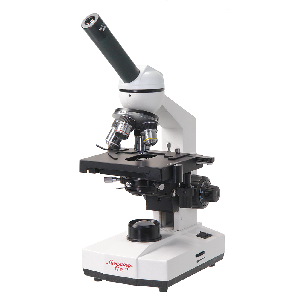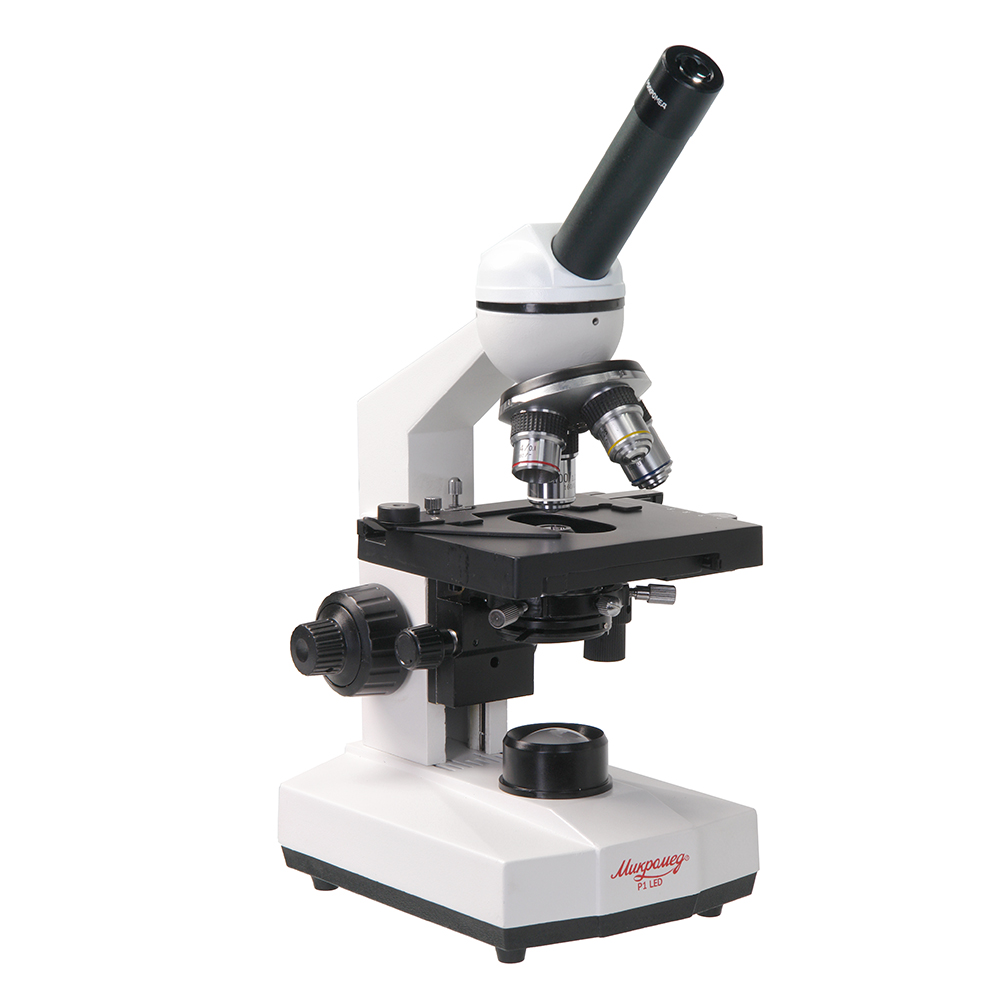 - Микроскоп Микромед Р-1 (LED) со встроенным в основание осветителем с регулировкой яркости, механизмом фокусировки и предметным столиком 100 мм х 125 мм – 1 шт.