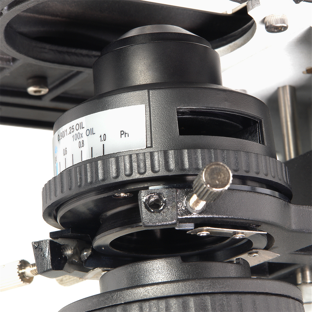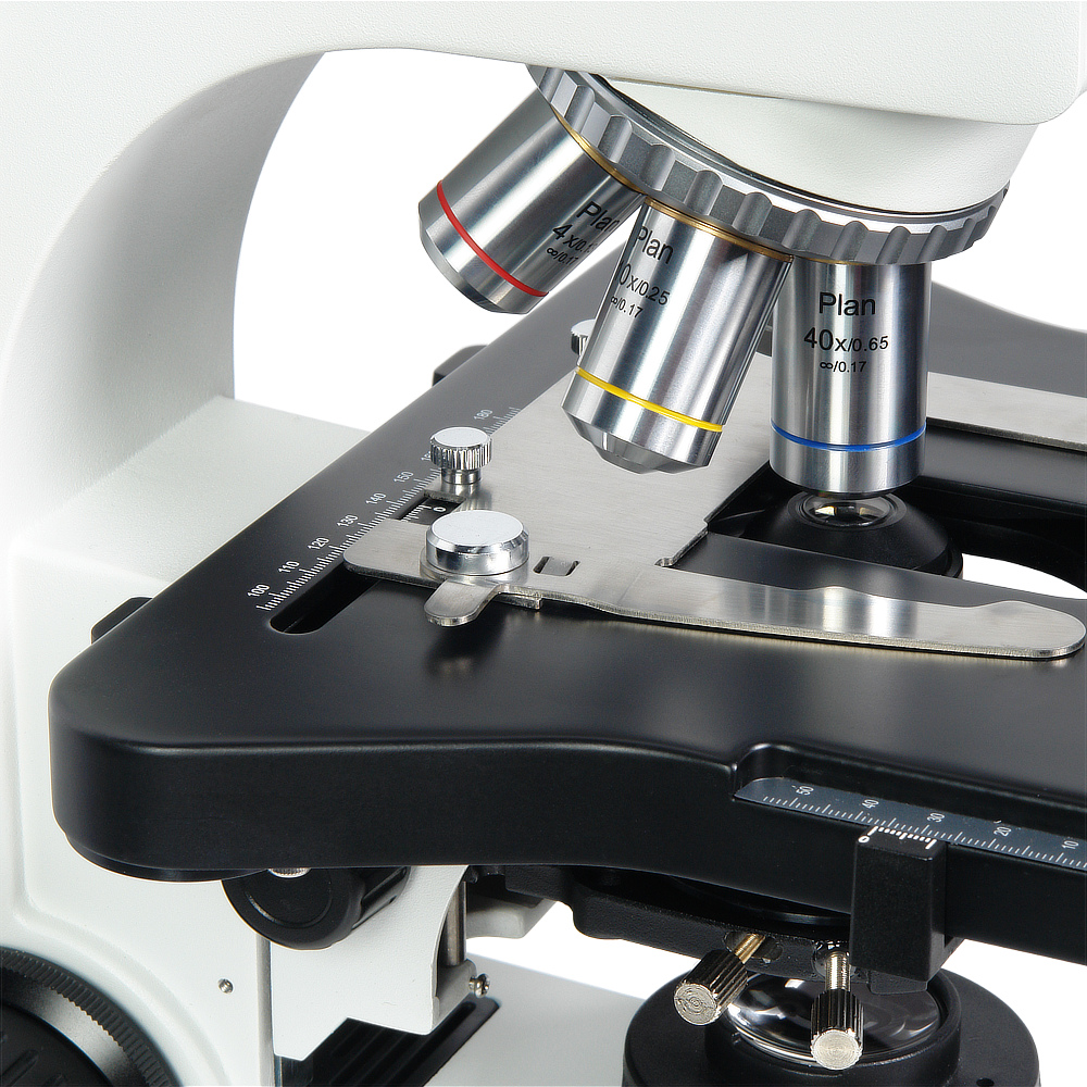 В комплекте микроскопа - объективы с планахроматической коррекцией Plan 4x/0.13, Plan 10x/0.25, Plan 40x/0.65 и Plan 100x/1.25 oil. По дополнительному заказу микроскоп может быть укомплектован объективами Plan 20х/0.45, Plan 60х/0.80, флюоритовыми объективами Plan Fluor, объективами для работы в поляризованном свете SP POL и объективами фазового контраста Plan PH. Антигрибковое покрытие оптических поверхностей объективов позволяет без ограничений использовать микроскоп в биологических лабораториях.