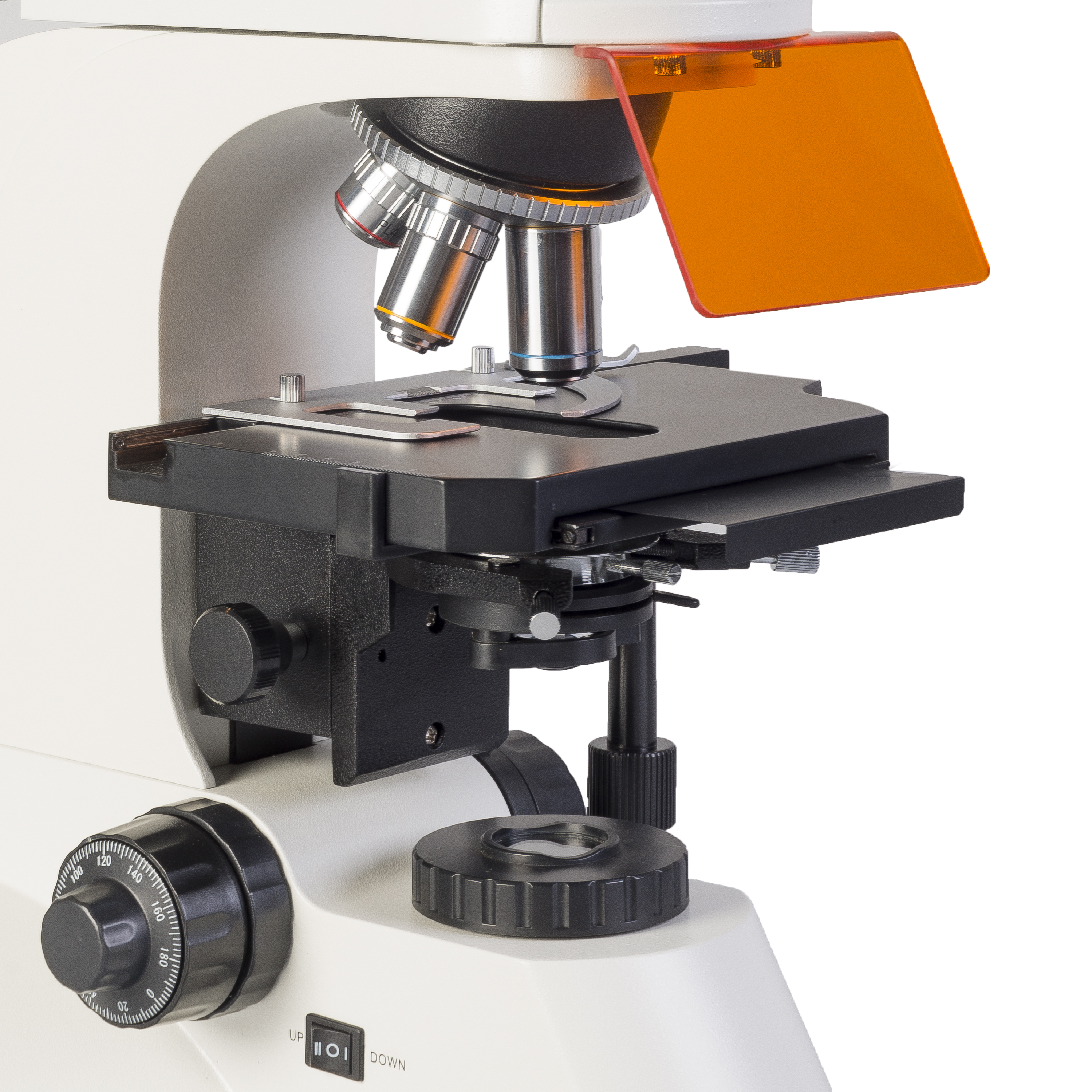 Четыре спектральные области позволяют исследовать препараты, окрашенные всеми существующими типами флюорохромов и наблюдать неокрашенные объекты, обладающие свойствами самостоятельной люминесценции. Установка необходимого диапазона или обычного света осуществляется поворотным диском с 5 положениями, положение «0» предназначено для исследований в обычном отраженном свете.