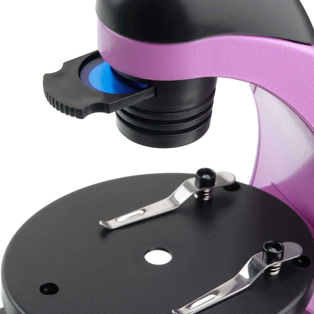 Осветитель проходящего света расположен над предметным столиком и состоит из конденсора со слотом для светофильтра и светодиода, имеющего спектр излучения, близкий к дневному. Такая подсветка безопасна для зрения, не утомляет глаза и позволяет проводить исследования в течение длительного времени. Осветитель имеет регулировку яркости. Для питания используются широко распространенные щелочные батарейки типа АА. Независимость от электросети, компактные размеры и малый вес микроскопа позволяют брать его с собой в поездки и на природу.