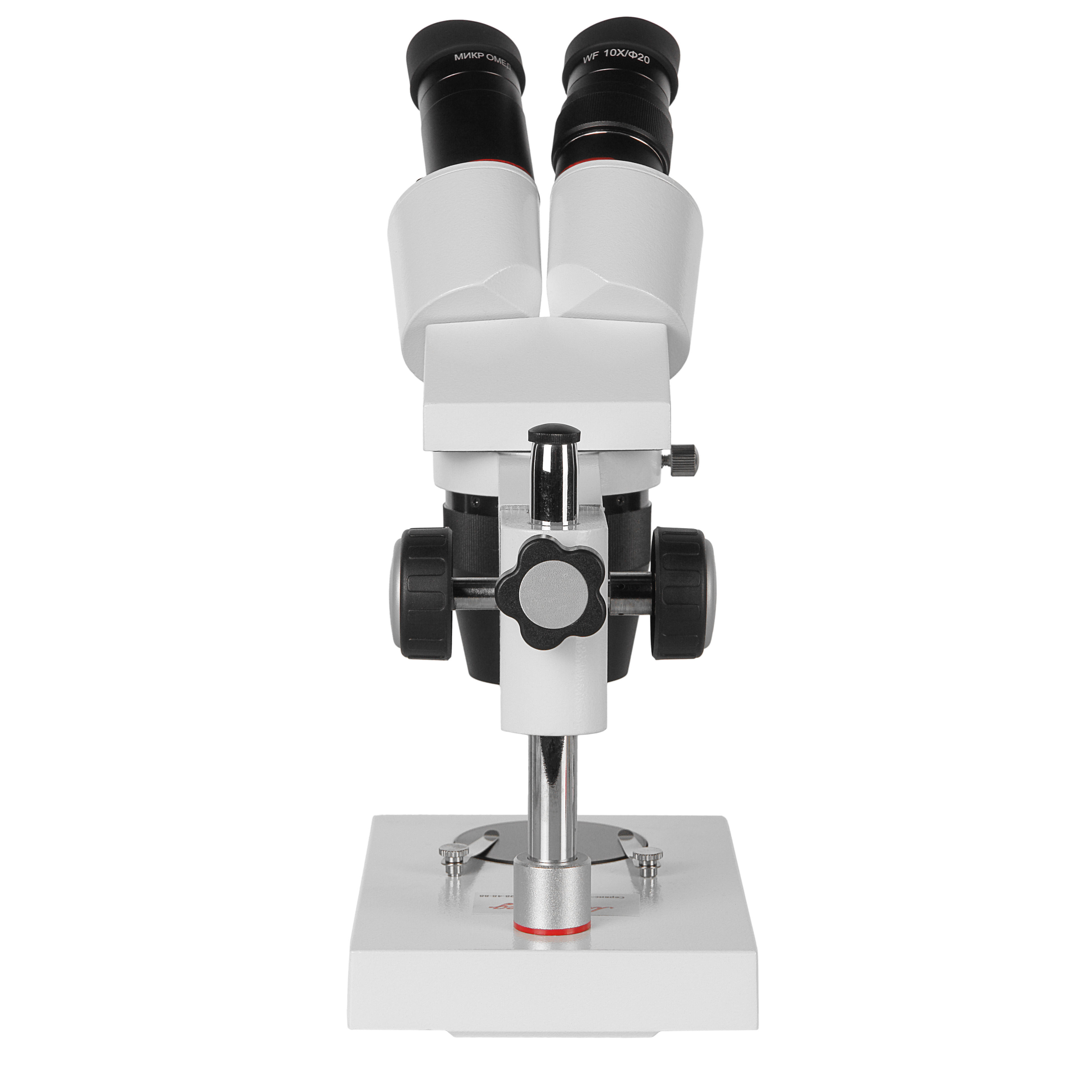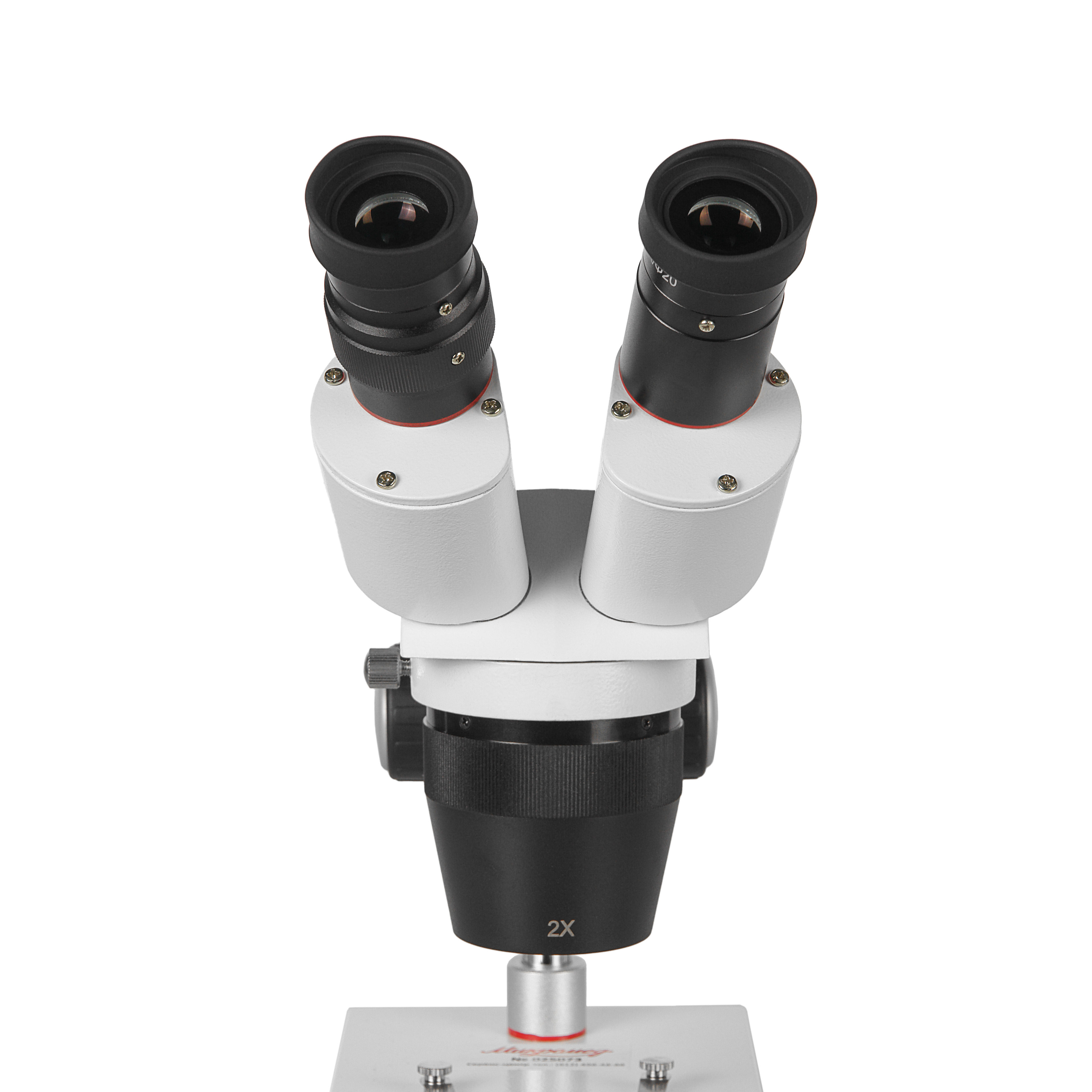 10551Стереомикроскоп с двумя фиксированными увеличениями 20х и 40х для наблюдения прямых изображений трехмерных и плоских объектов. Постоянное рабочее расстояние 76 мм. Подсветка от дополнительного источника или внешнего света.