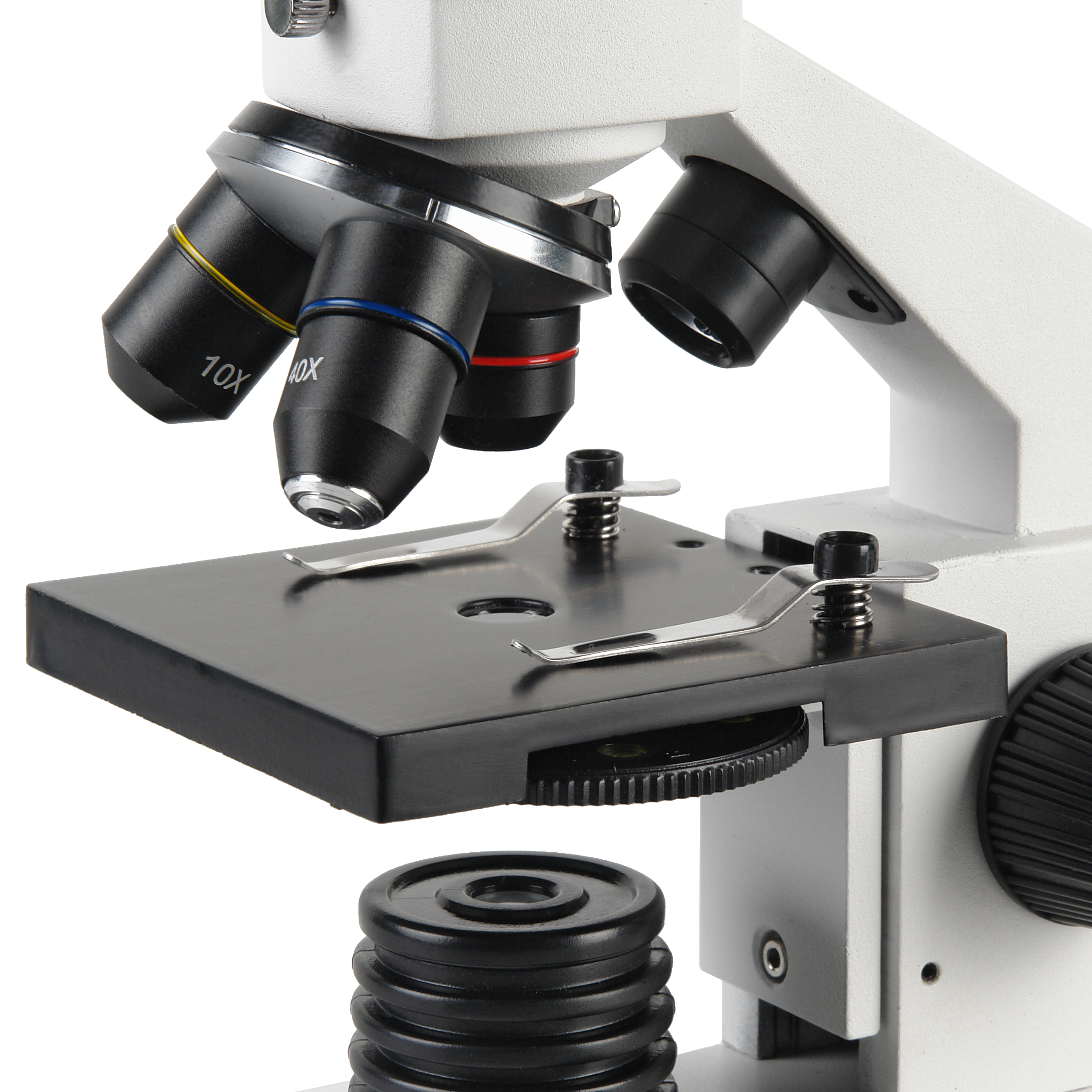 В комплекте микроскопа резкие ахроматические объективы 4x/0.10, 10x/0.25 и 40x/0.65, позволяющие наблюдать детальные и яркие изображения. Объектив 40x/0.65 имеет конструкцию оправы с подпружиненным оптическим блоком, что препятствует повреждению объектива и изучаемого образца. Все оптические элементы микроскопа - объективы и окуляры изготовлены из оптических стекол высокого качества и имеют просветляющее покрытие. Объективы микроскопа установлены на револьверном устройстве, что позволяет наблюдателю быстро переходить к исследованиям с различными увеличениями.