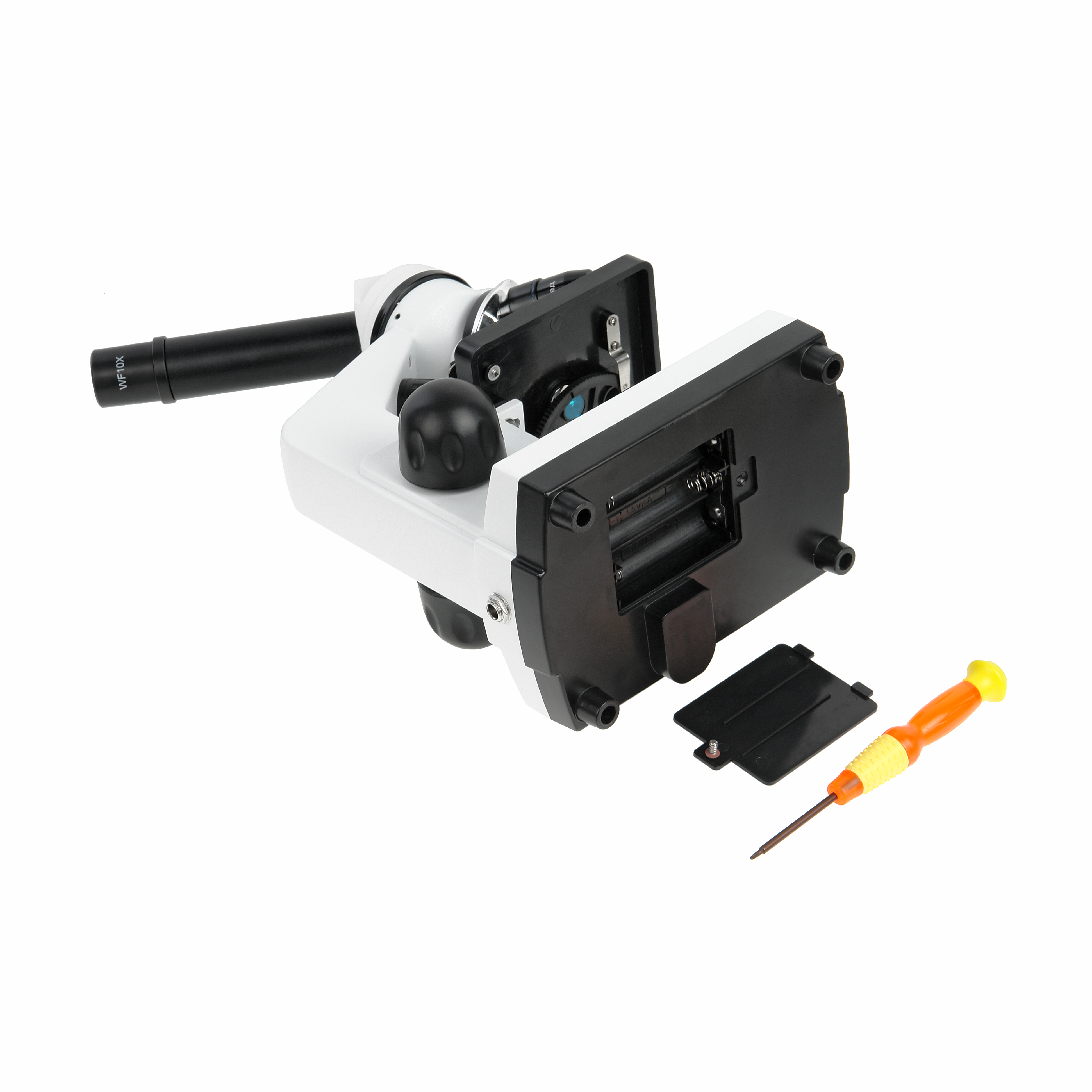 30417Монокулярный учебный микроскоп с камерой 1.3 Мр для наблюдения и записи файлов в проходящем и отраженном свете. В комплекте три объектива с ахроматической коррекцией. Два осветителя на светодиодах. Питание от батарей или от сети.