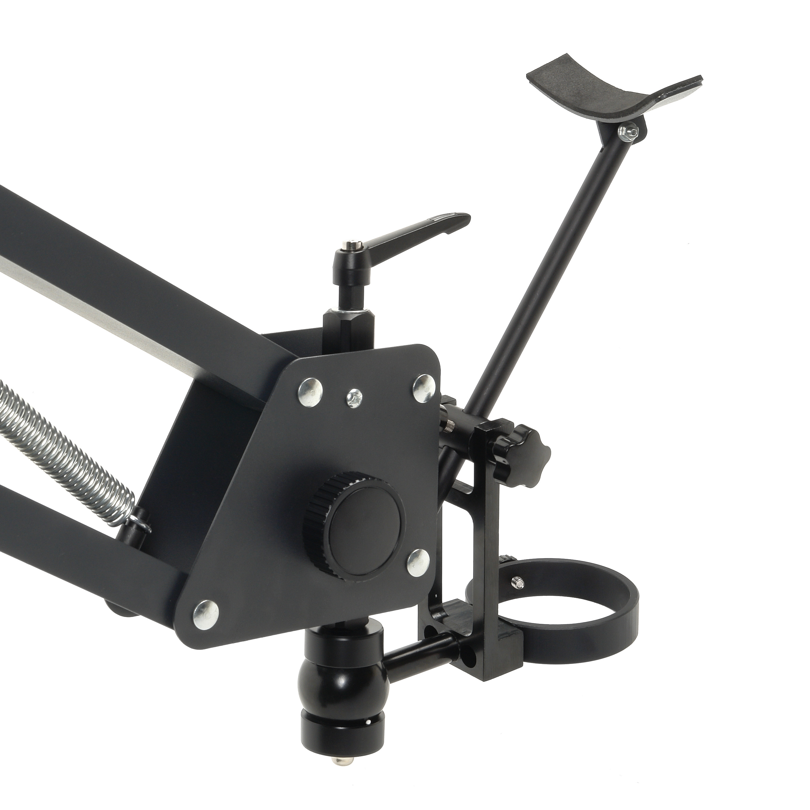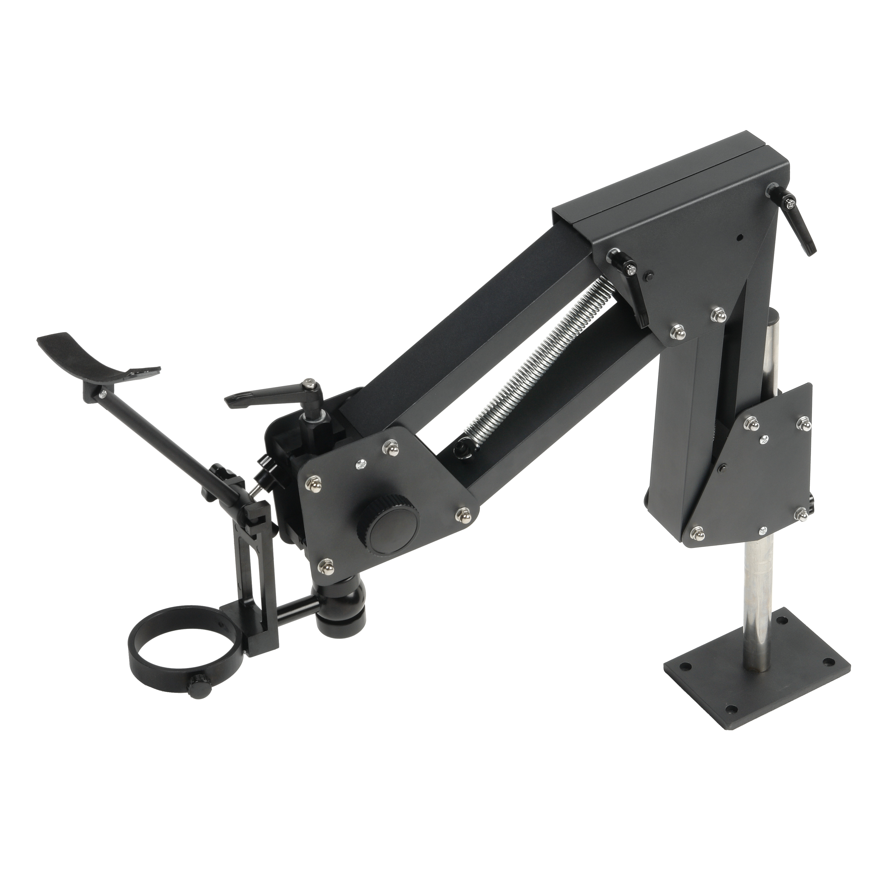 Перемещение оптической головки обеспечивается рычажным механизмом с пружинным противовесом, это позволяет настроить положение головки без лишних усилий. Рычаги имеют регулировку усилия перемещения и фиксатор. Конструкция механизма позволяет легко складывать штатив для минимизации пространства.