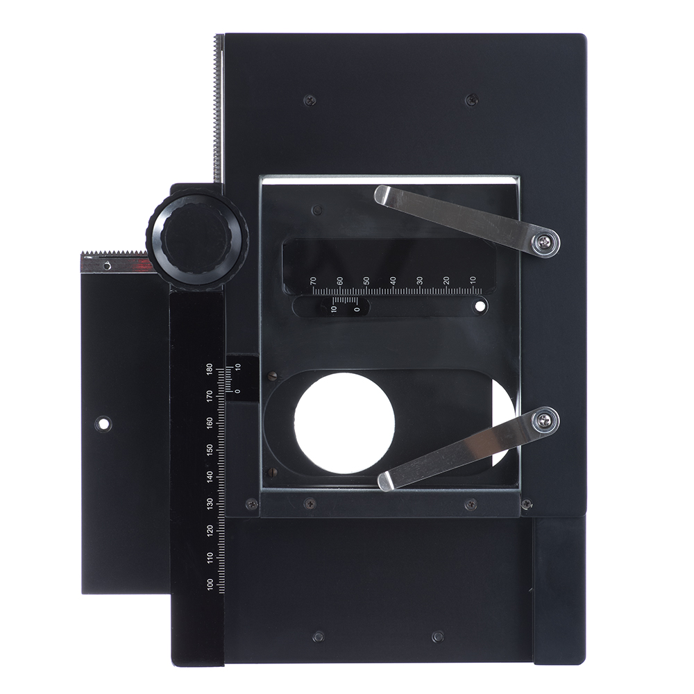 Позволяет работать с осветителем проходящего света, встроенным в основание микроскопа, так и с осветителями отраженного света. В комплект столика входят два пружинных держателя препарата.