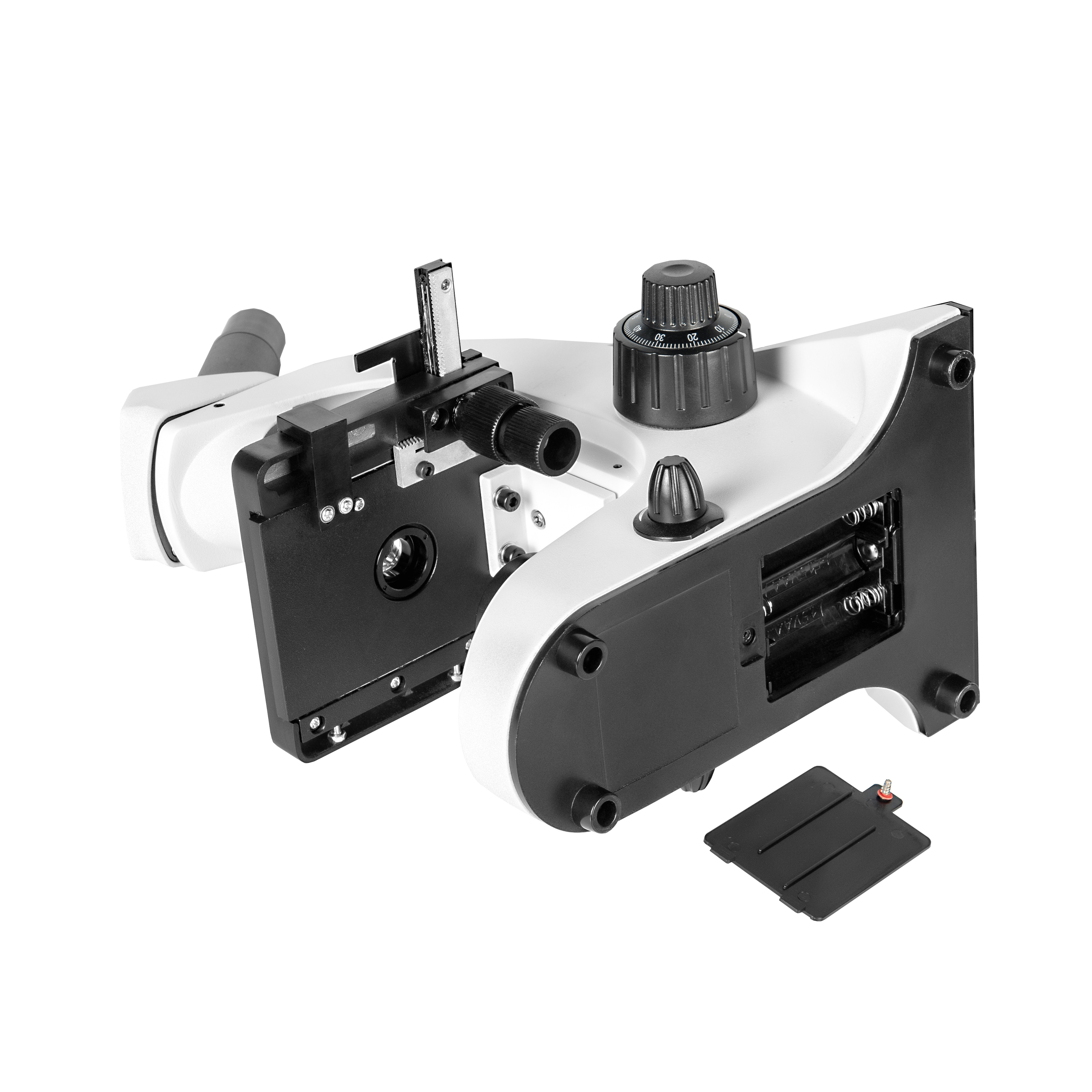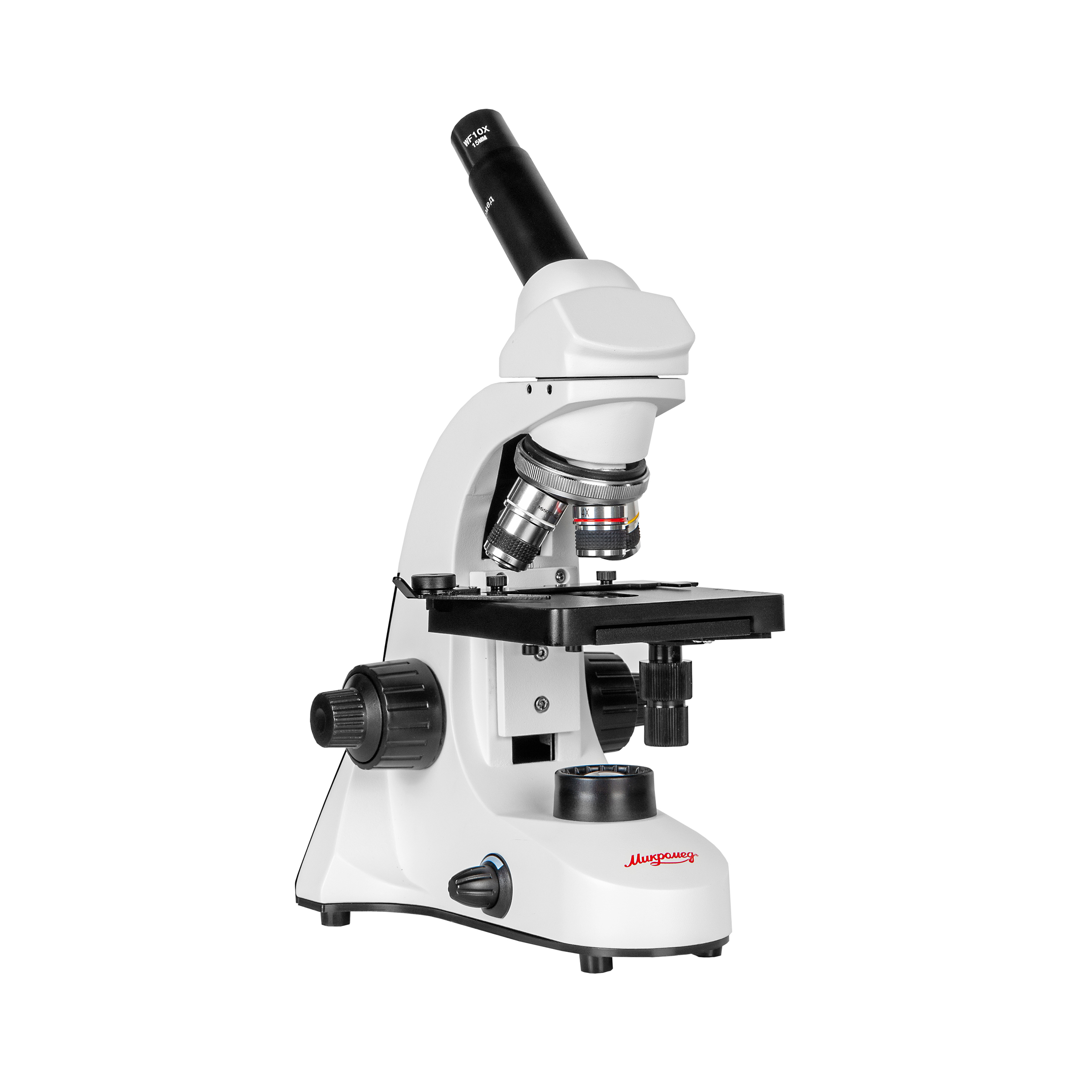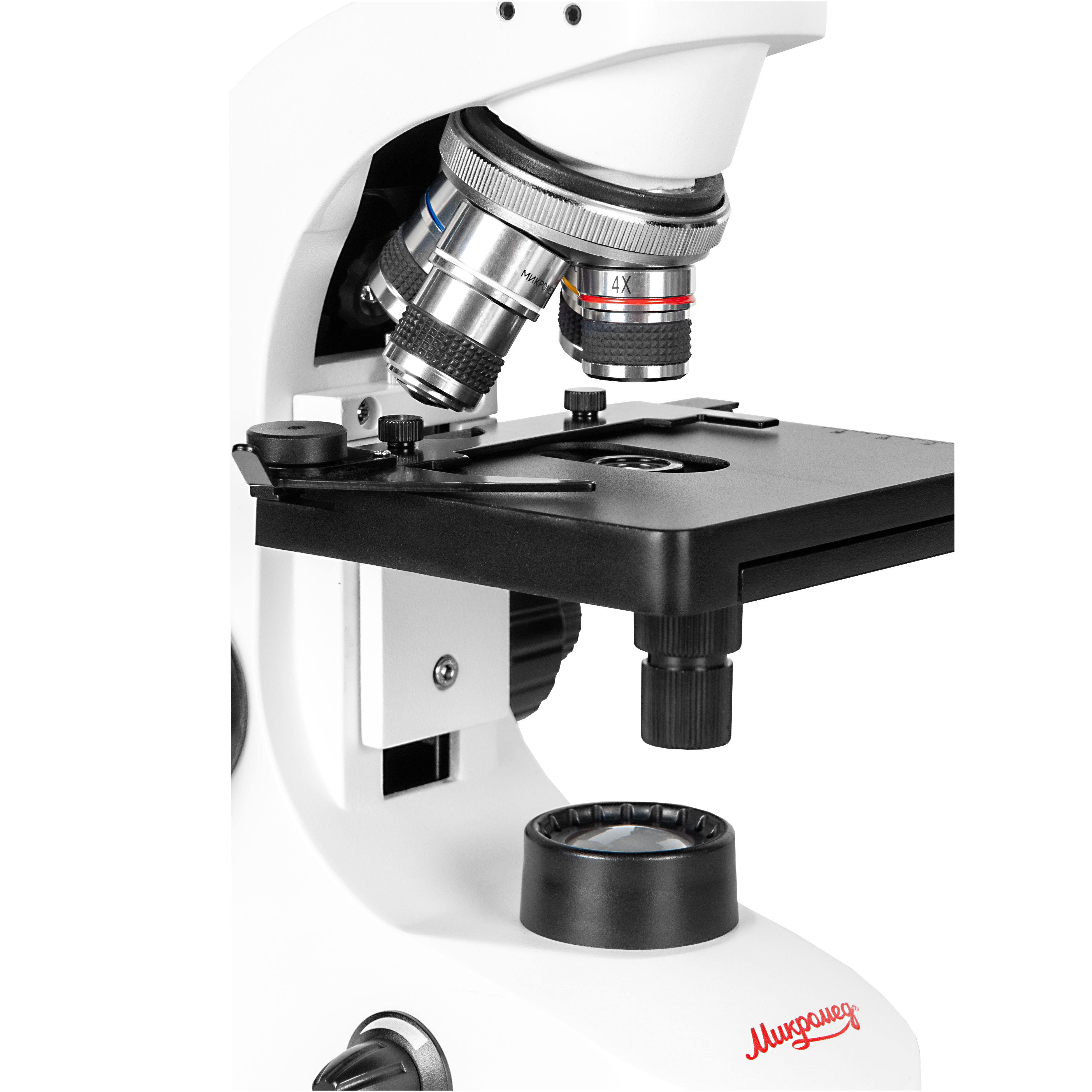 - Штатив со встроенным в основание LED осветителем проходящего света, LED осветителем отраженного света, револьверным устройством на 4 объектива и механизмом тонкой и грубой фокусировки
