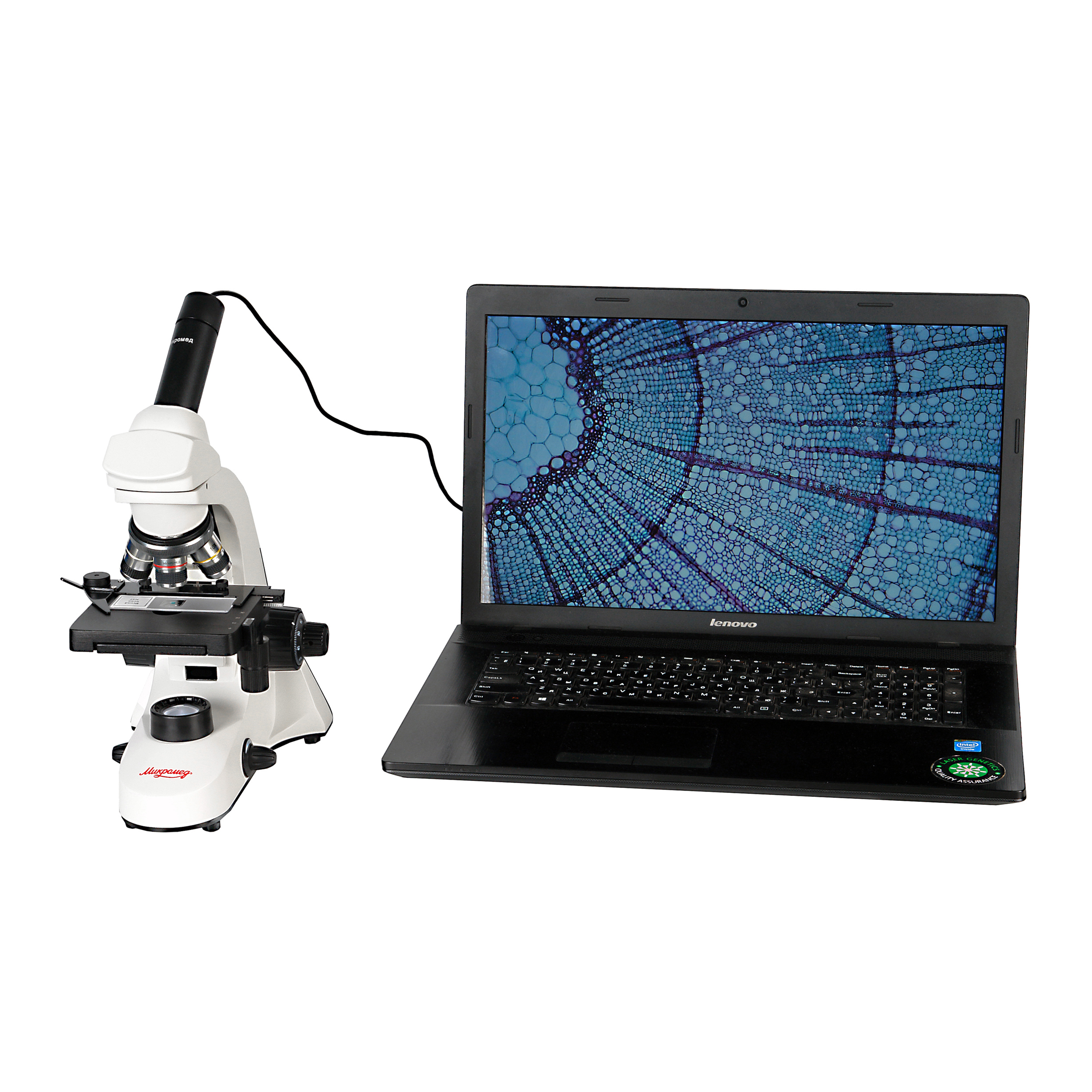 Цифровая камера 2Мп входит в комплект микроскопа. Изображения и видео с камеры передается на ПК через порт USB 2.0. Возможность подключения к ПК предоставляет исследователю дополнительные возможности – просмотр на большом мониторе, сохранение, обработка и систематизация результатов. Камера передает на ПК видеоряд с частотой 25 к/с и разрешением Full HD -1600×1200. Камера построена на цветном 2Мр CMOS сенсоре 1/3 дюйма с физическими размерами 3.5 х 4.8 мм. В комплекте поставляется ПО StrangeView на оптическом носителе. Камера устанавливается непосредственно в окулярный тубус микроскопа, без линзы Барлоу. Питание камеры осуществляется от порта USB 2.0 компьютера.