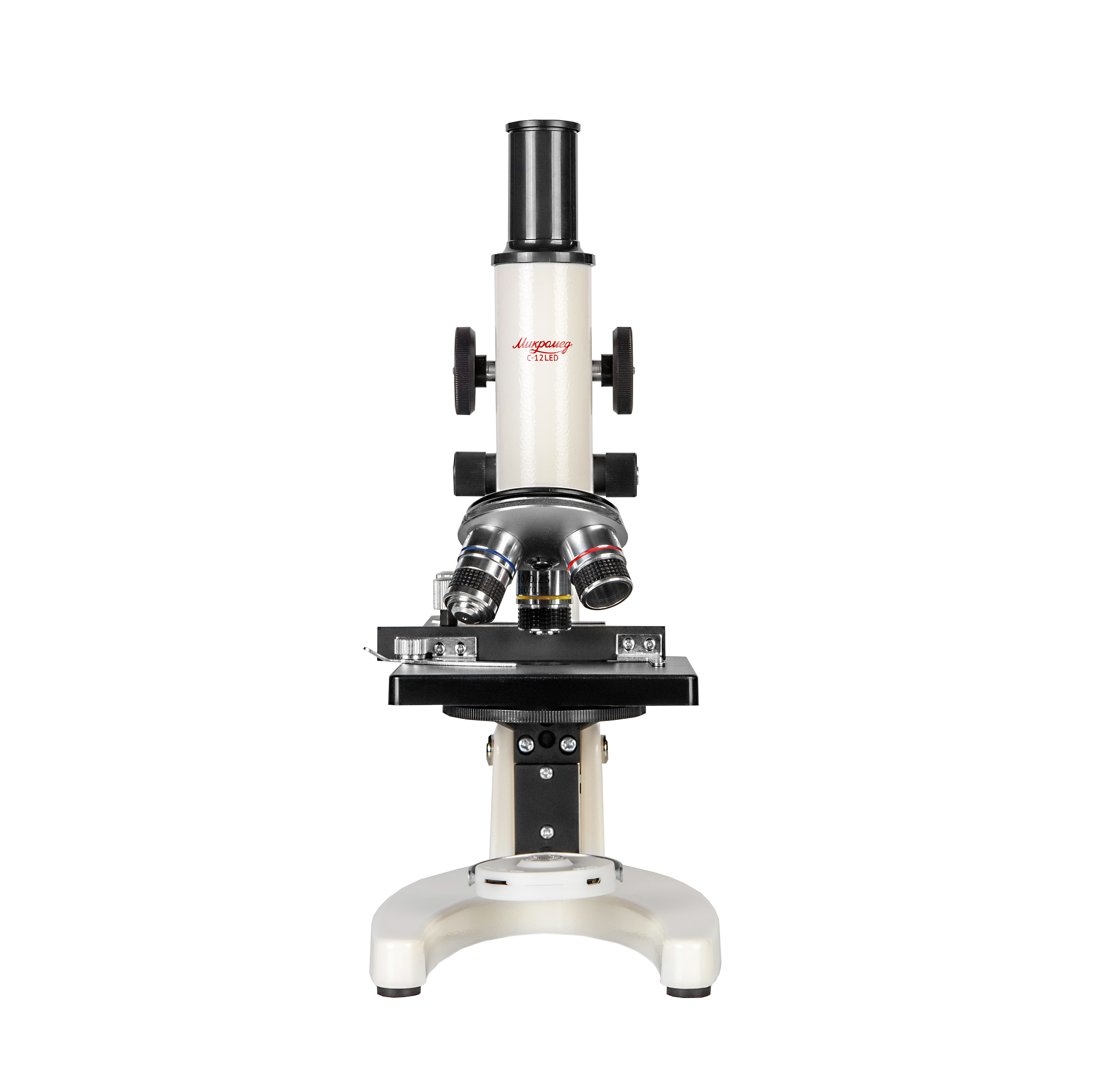 32841Монокулярный учебный биологический микроскоп для исследований методом светлого поля в проходящем свете. Увеличение 40х – 800х. Объективы с ахроматической коррекцией. Револьверное устройство на 3 объектива. Механизм тонкой фокусировки. Зеркальный и светодиодный осветитель. Металлический штатив.