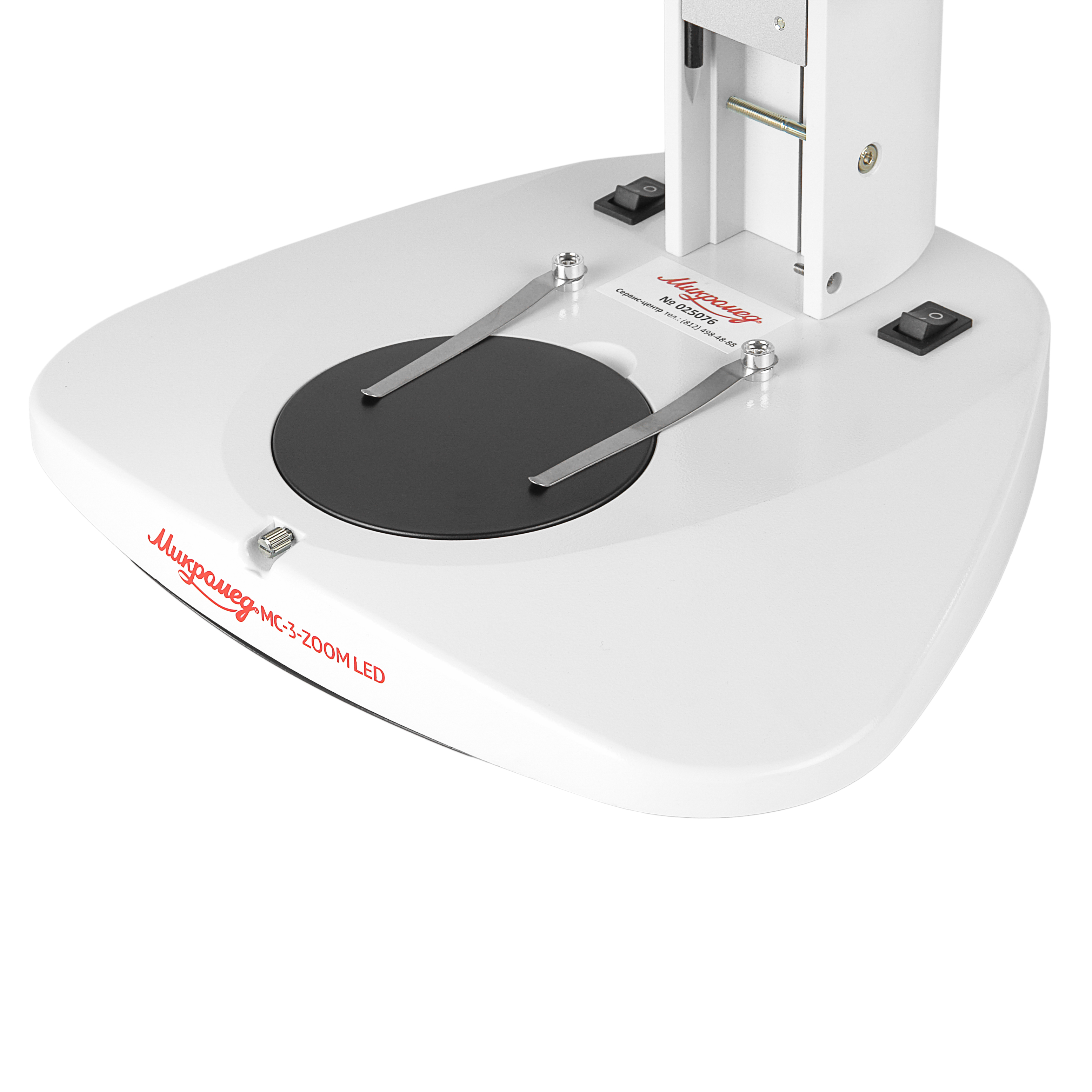 Исследования в проходящем свете проводятся при исследовании объектов, способных пропускать свет. Например, биологических образцов, минералов или прозрачных полимеров. Осветитель проходящего света встроен в основание микроскопа. В качестве источника света используется светодиод 1 Вт с дневным спектром излучения. Осветитель комплектуется рассеивающим фильтром. Для размещения объекта исследования в комплекте микроскопа имеются предметные вставки – полупрозрачная для проходящего света, двухсторонняя черная/белая для исследований в отраженном свете. Оба осветителя работают от блока постоянного тока, встроенного в основание микроскопа, и имеют плавную независимую регулировку яркости.