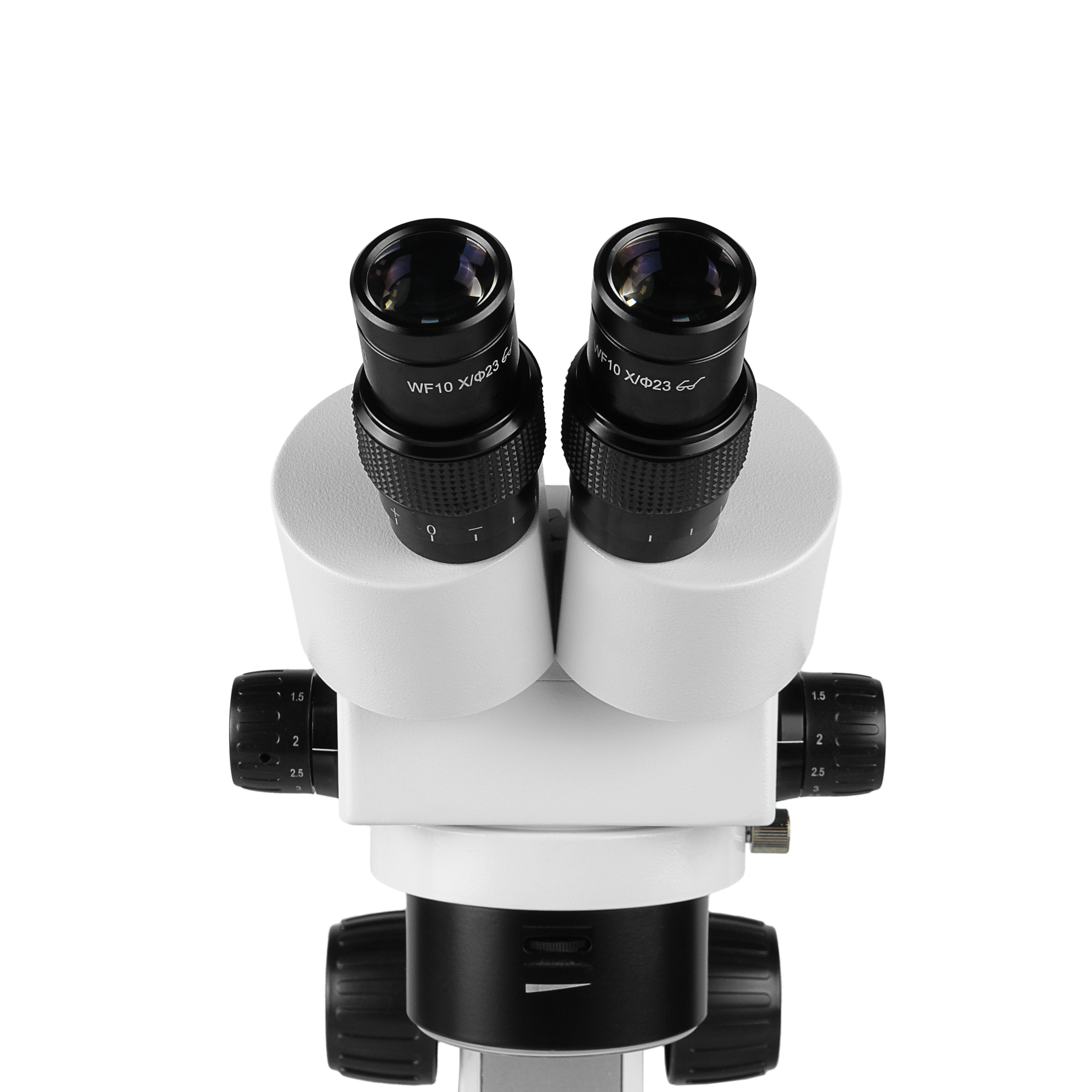 Увеличение микроскопа с окулярами WF 10х/23, входящими в комплект, составляет от 7,5х до 50х. Для микроскопа выпускаются окуляры WF 5х/23, WF 15х/15 и WF 20х/13.5. С этими окулярами общий диапазон увеличений микроскопа составит от 3.8х до 100х. Для микроскопа также доступен окуляр WF10х/23 со шкалой, позволяющий проводить измерение линейных размеров деталей объектов.